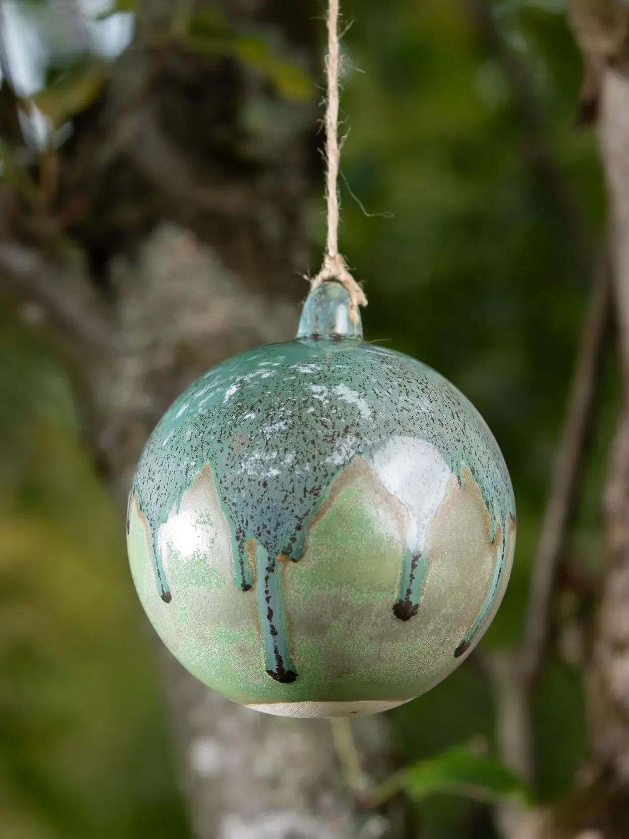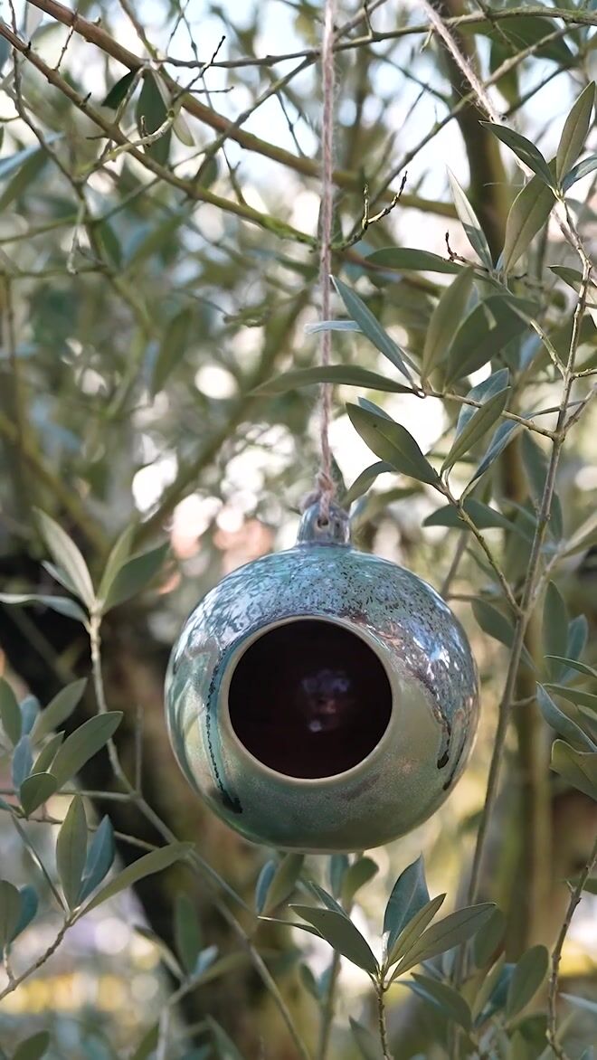 As seen on ITV ‘Be Your Own Boss’. This is a Stoneware Ceramic globe-shaped hanging Bird Feeder. Fired to over 1200C and durable enough to withstand harsh weather in the garden. We have made the original mould ourselves and cast the mould with liquid stoneware slip. After it has been fired we paint it with a combination of glazes and fire again to 1220C. This high temperature vitrifies and strengthens the clay and creates beautiful, unpredictable and unique glaze finishes, no two will be the same. And just to reassure you, they’re not only beautiful but fully functional; we’ve tested them ourselves, and the little garden visitors—robins, blue tits, and plenty of others—absolutely love them.
