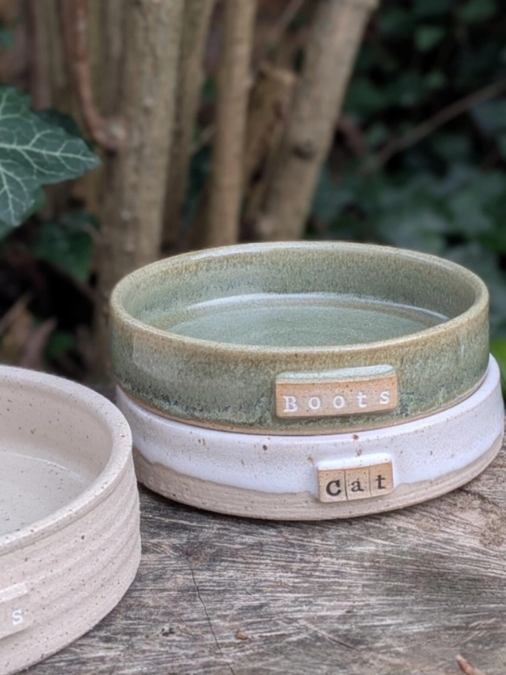 Personalised name pet bowls handmade using a buff speckled stoneware, and glazed in a choice of meadow green, rustic white, shoreline, or raw speckled clay with a clear glossy interior.