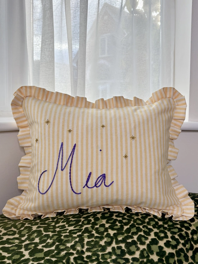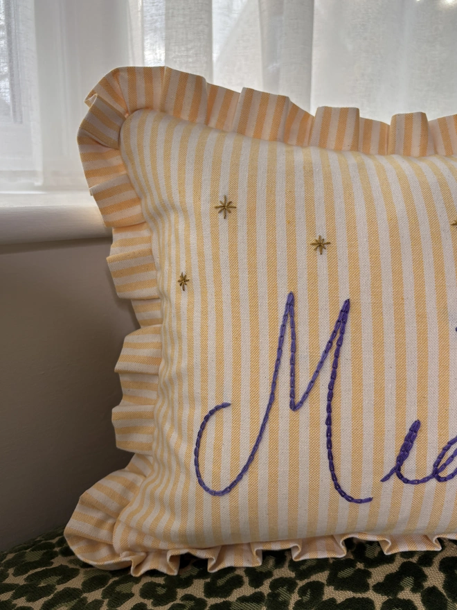 Yellow Stripe fabric to the front and back of this 45cm x 35cm cushion with frill and zip opening...