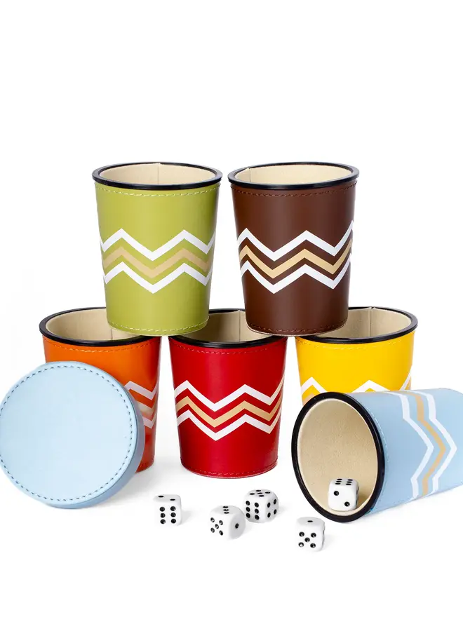 This luxury & colourful version of the classic Perudo game will make a stylish addition to any games evening and the perfect gift for a game lover. Each of the 6 dice cups are bound in colourful leather with our signature zigzag print. Each game comes in a gift box.