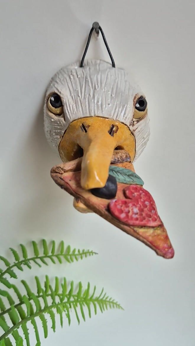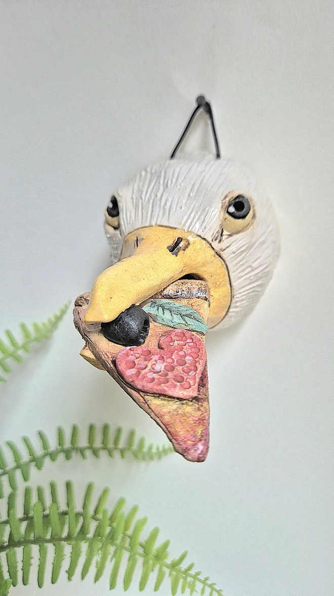 This pesky seagull has stolen your pizza; complete with a heart shaped piece of salami, an olive and a basil leaf!