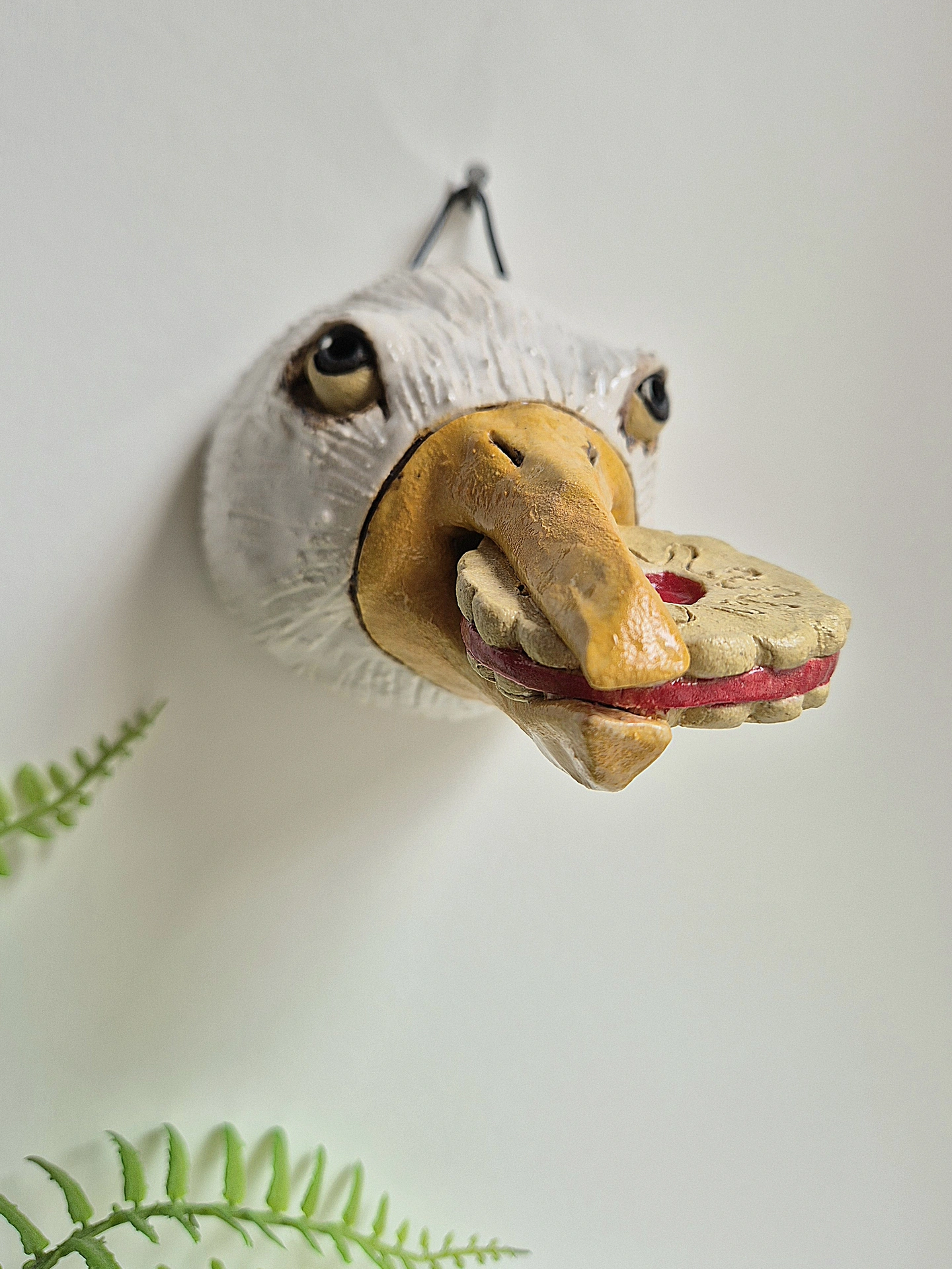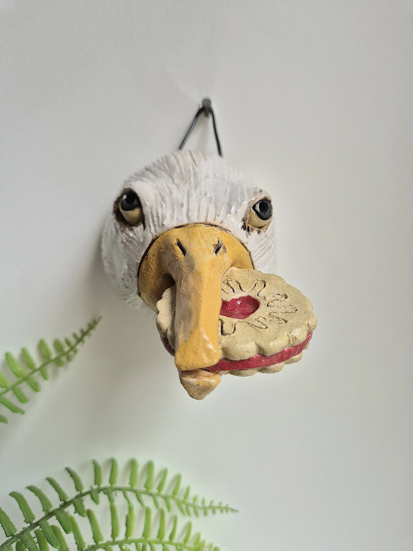 She then paints them before the second firing. There is quite a flock to collect now with a variety of foods! These gulls are finished with a slightly, shiny, opaque white glaze. It has a black cord to hang on the wall.