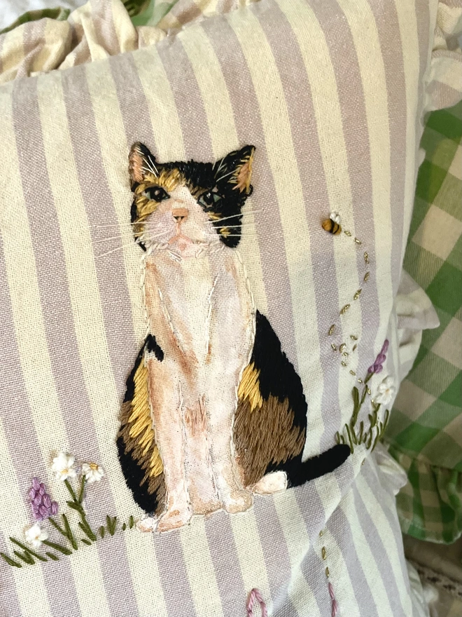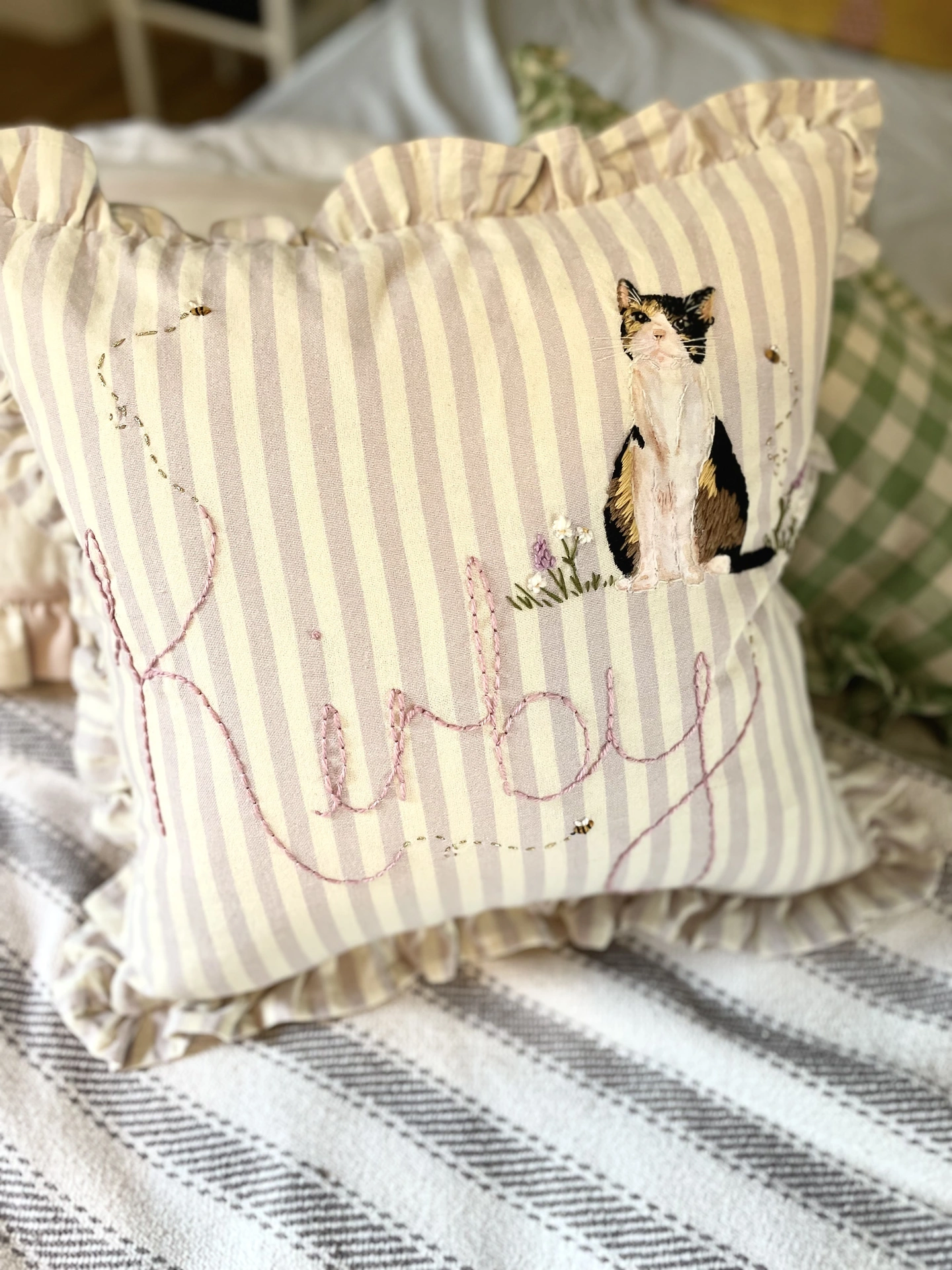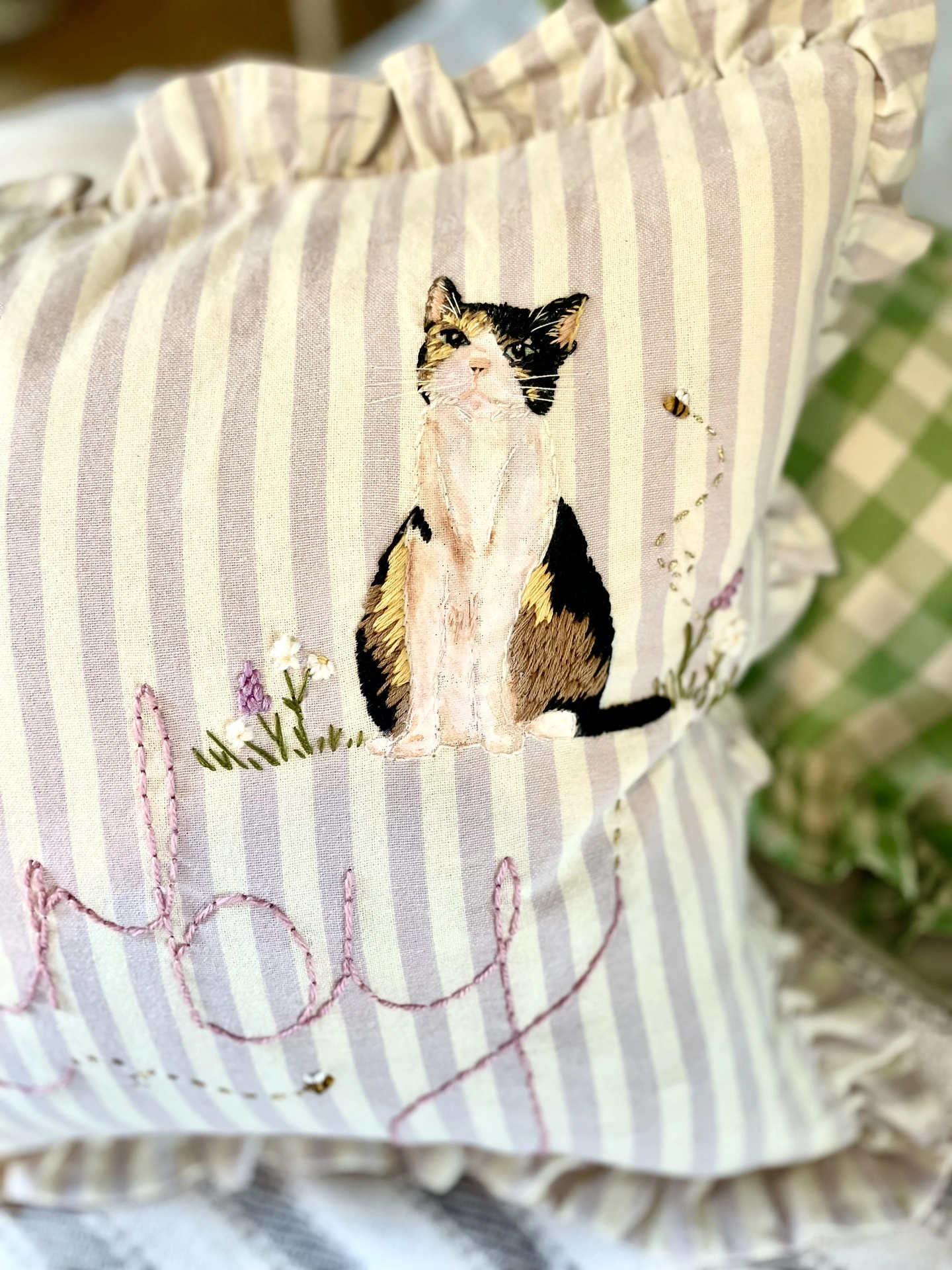 Lovingly stitched with fine detail, the embroidery captures the unique charm of your cat, making this cushion a perfect gift for pet lovers or a treasured keepsake for your own home. The gentle ruffle trim adds a playful finish, while the personalised name makes it truly one-of-a-kind.