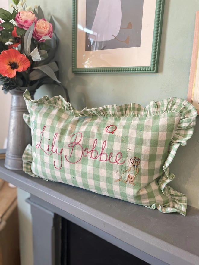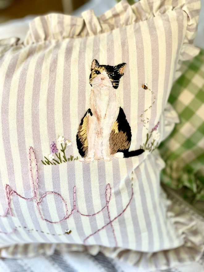 Celebrate your beloved pet with this beautifully bespoke cushion, crafted from soft cotton and finished with a delicate ruffle trim. Each cushion features a hand-embroidered portrait of your furry (or feathered!) friend, lovingly stitched from a photo you provide – capturing their unique character and charm in thread.