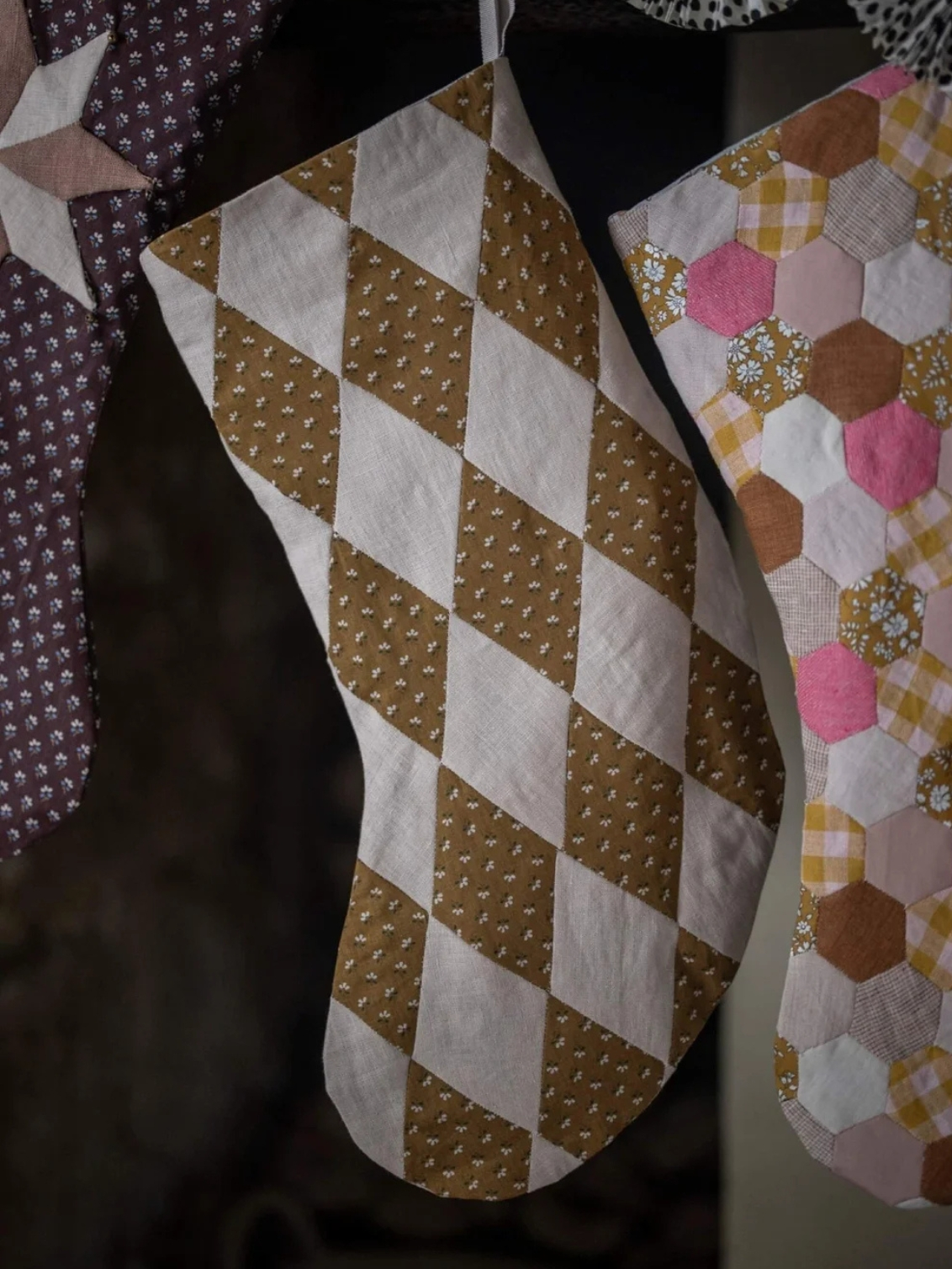Limited edition handmade patchwork stocking in palest cloud pink linen and mustard print harlequin design.