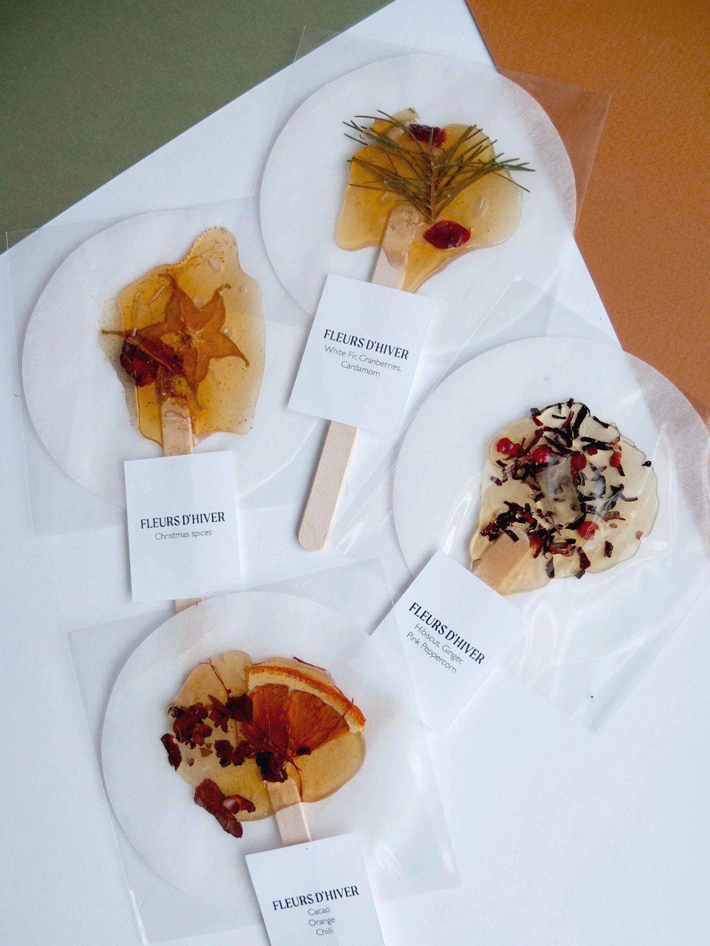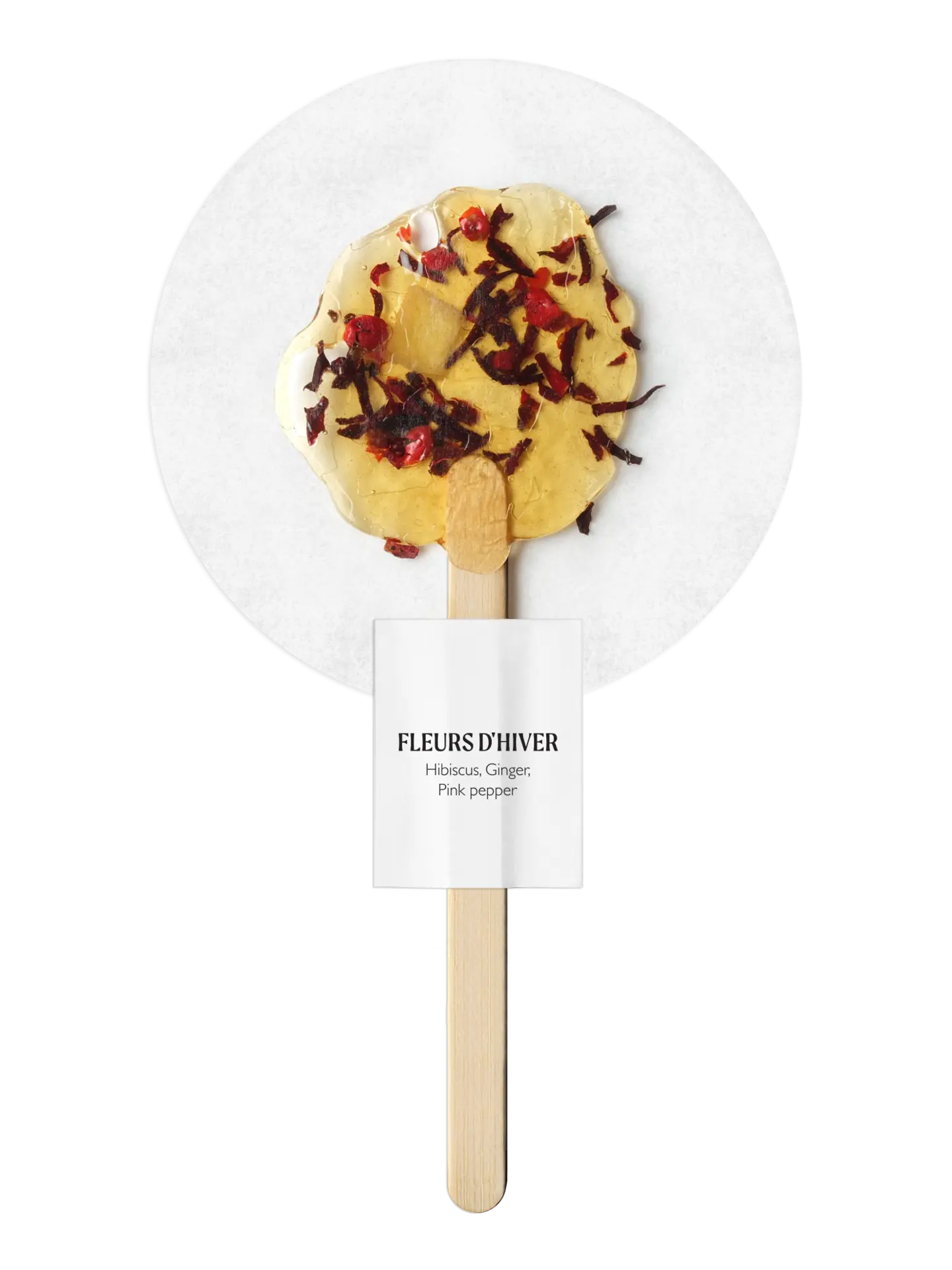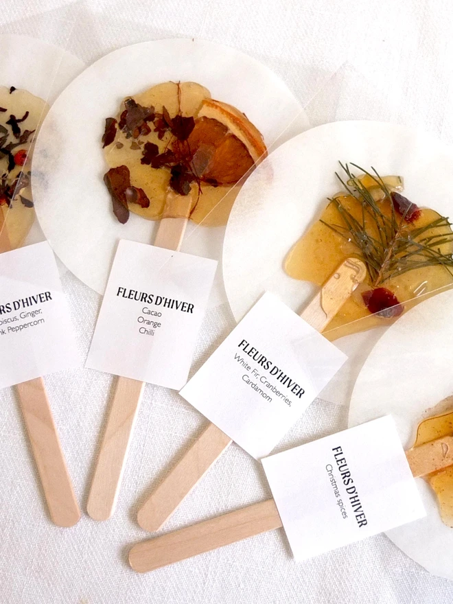 Each of the herbal teas are presented on a wooden stick, ready to be infused. The honey melts, the flowers infuse and bloom naturally in the hot water an image of beauty to accompany the taste for a moment of well-being.