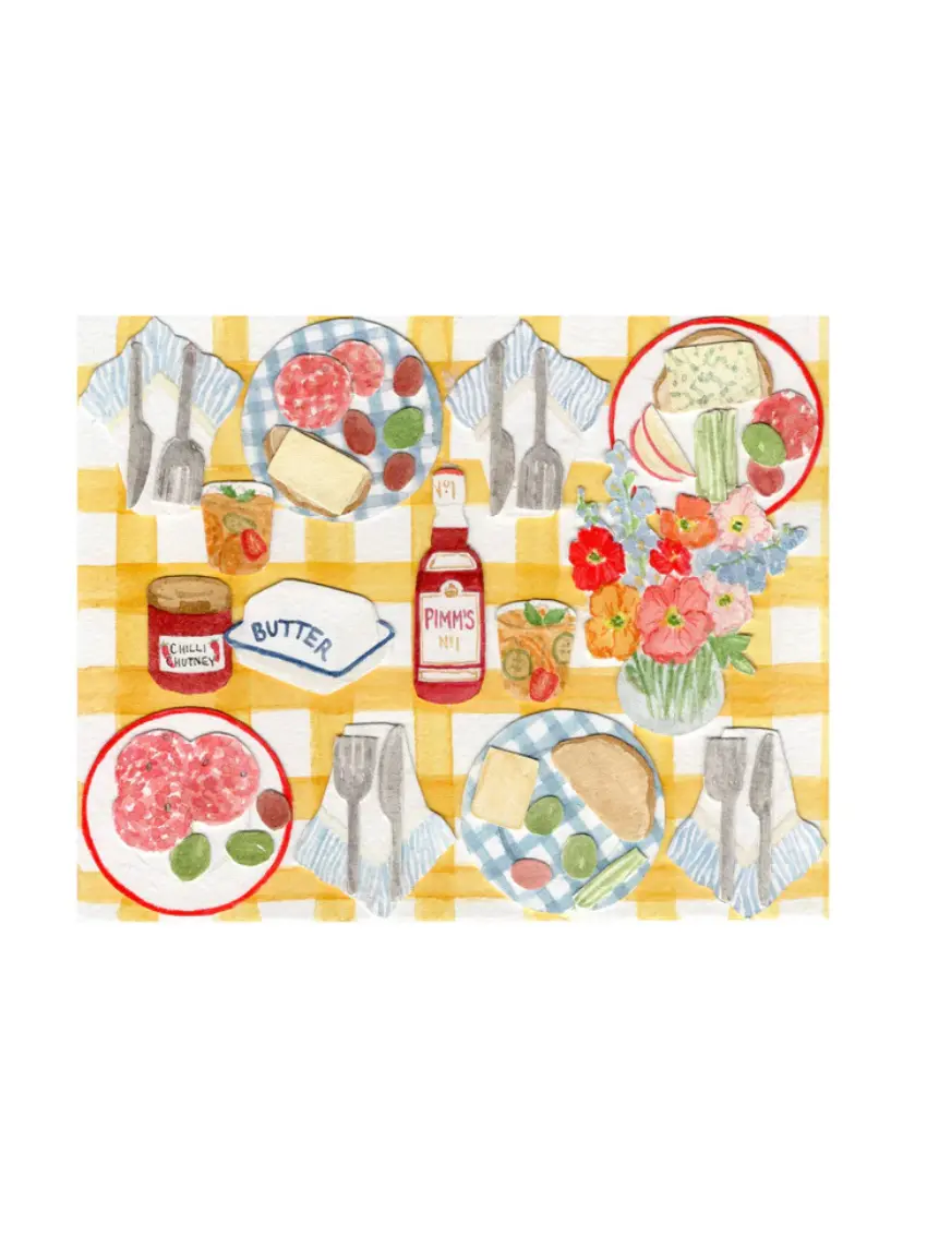 Printed card of an original hand illustrated collage of a Summer picnic scene.