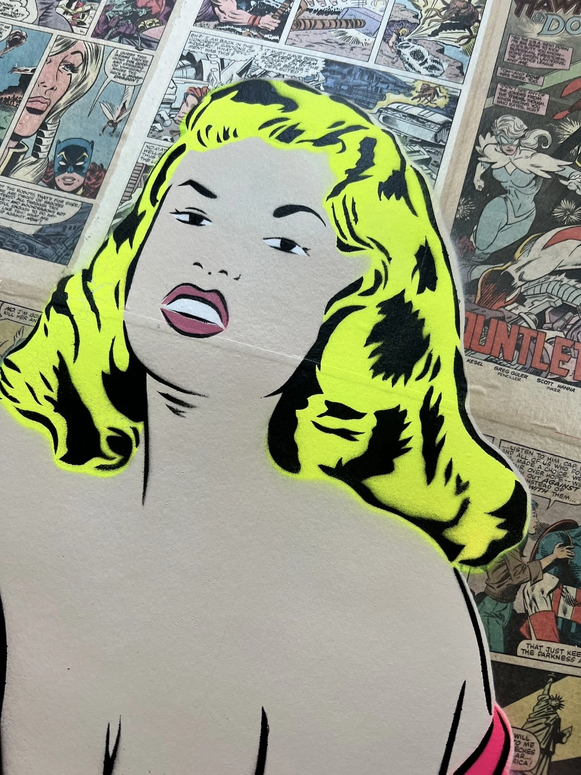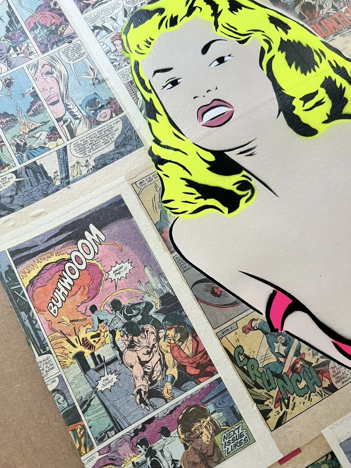 Original 1970’s comic pages wheat pasted to the heaviest paper around to give it an almost 'bill poster' look. Then drenched it in 3 coats of varnish gloss before painting and stencilling the iconic Jane Mansfield - the ultimate pin up.
