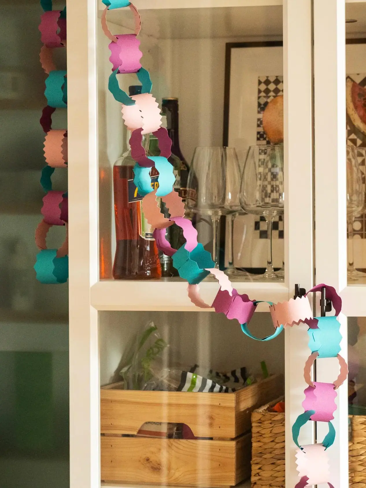 Celebrate summer with this beautiful paper chain featuring pink and blue colors. Made from textured paper in turquoise, pink, and purple, it will instantly brighten any corner of your home, making your space stand out! This paper chain is also perfect for...