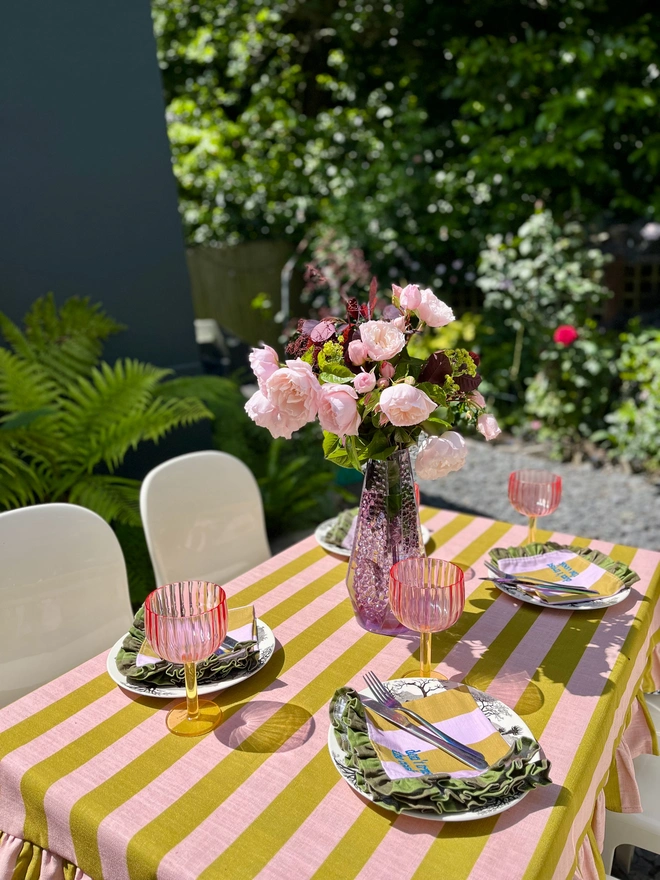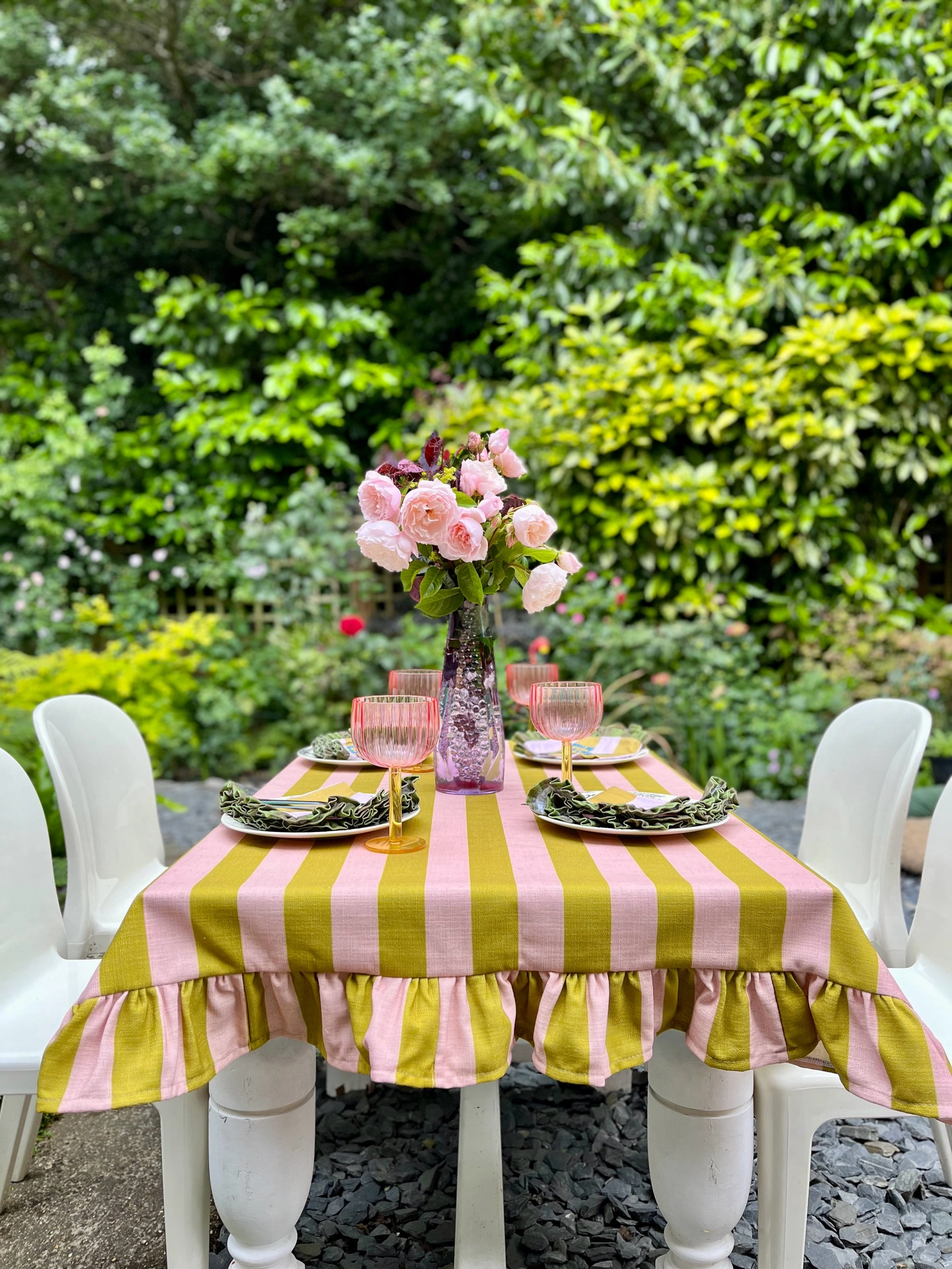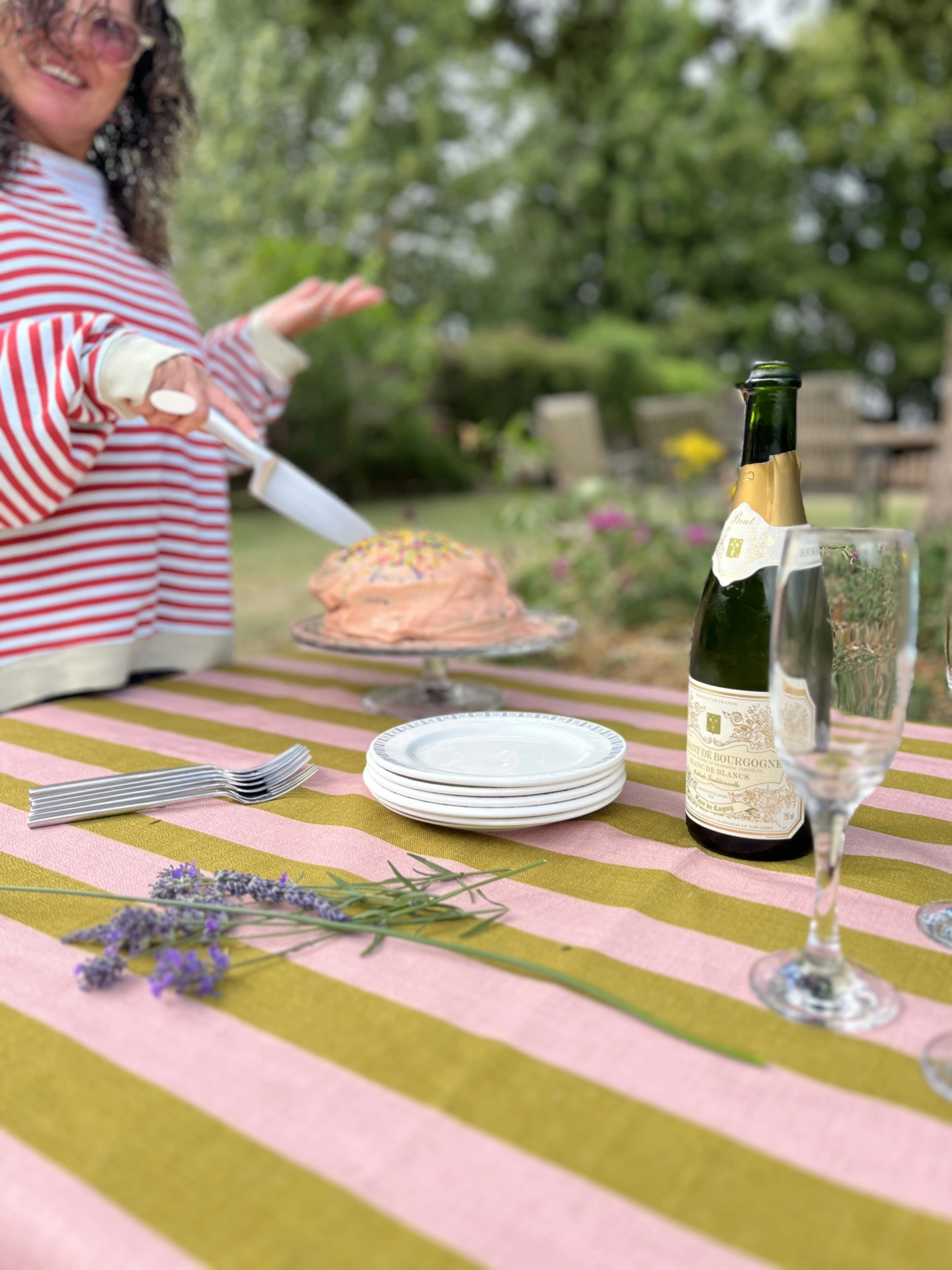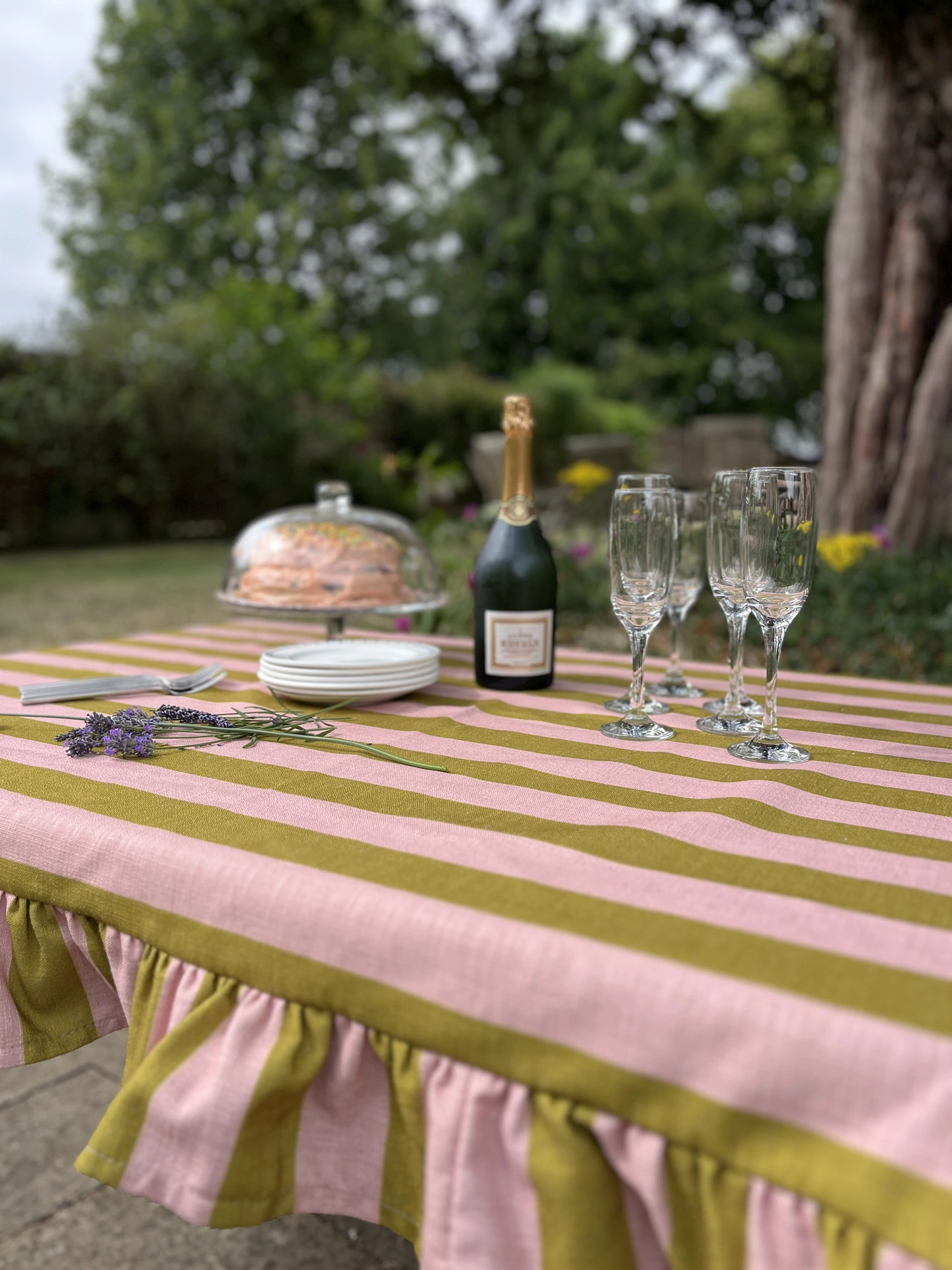 A decorative, hardwearing tablecloth featuring a classic 5cm stripe in pink and olive green. So classic, neutral and beautiful, it fits absolutely every setting, indoors and out!
