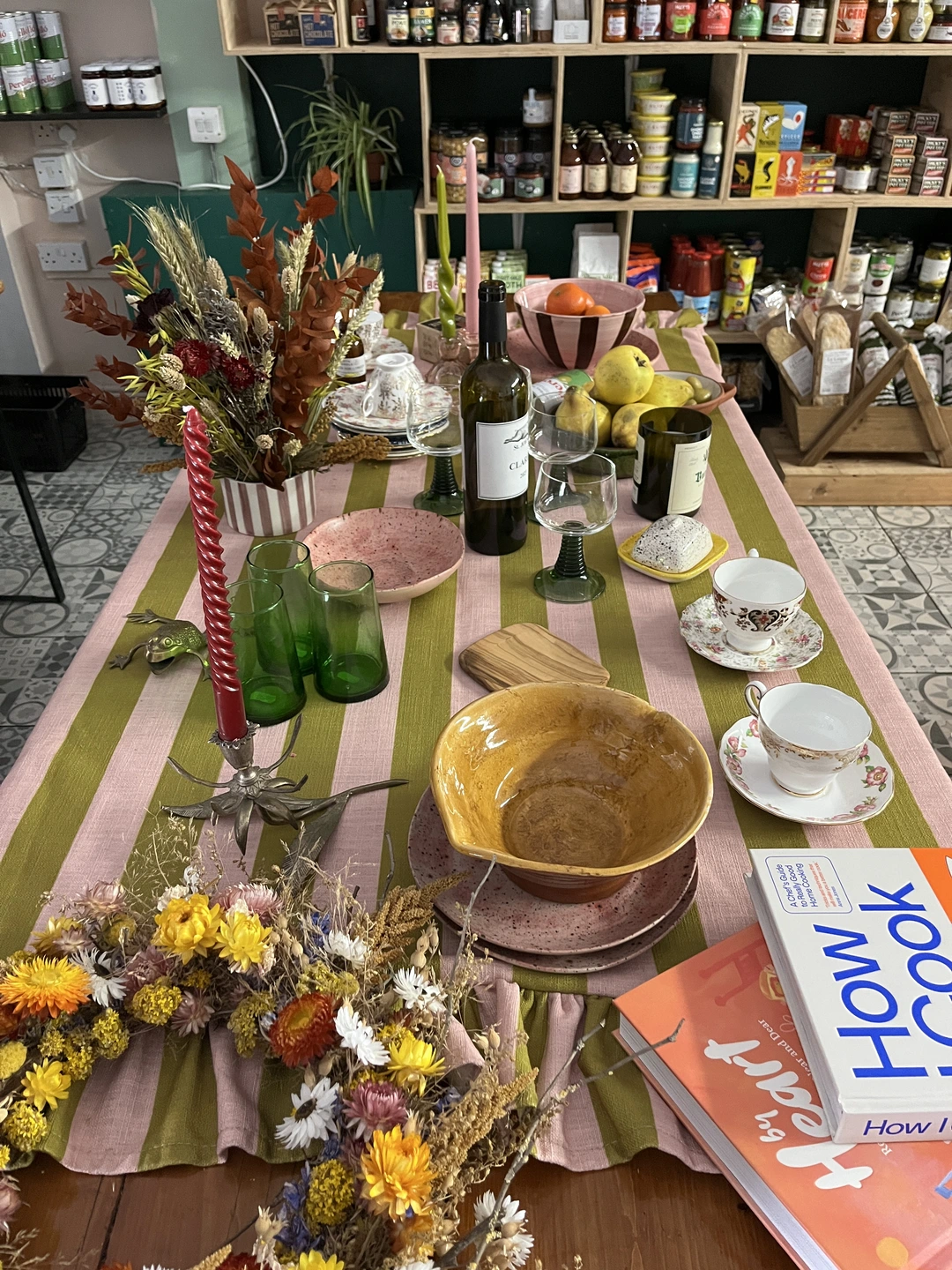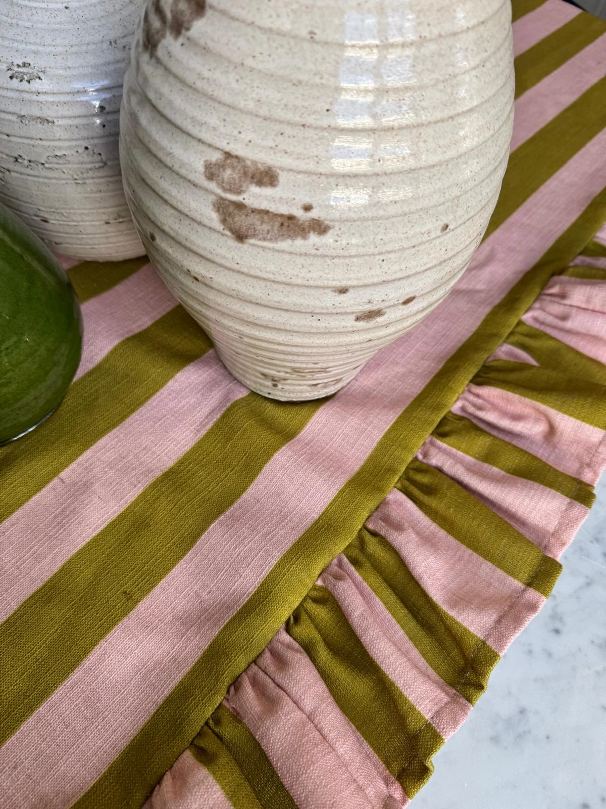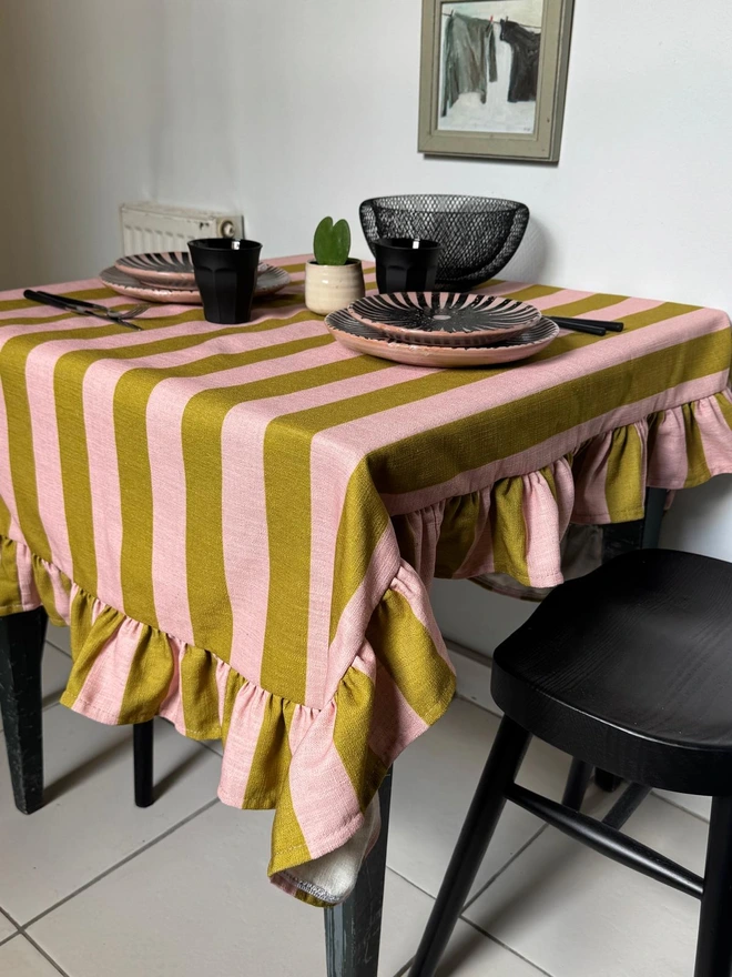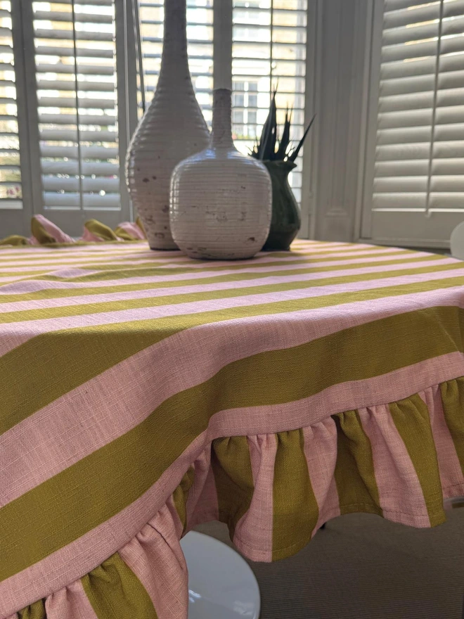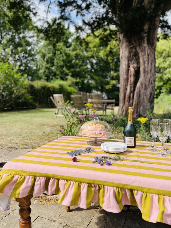 A decorative, hardwearing tablecloth featuring a classic 5cm stripe in pink and olive green. So classic, neutral and beautiful, it fits absolutely every setting, indoors and out!