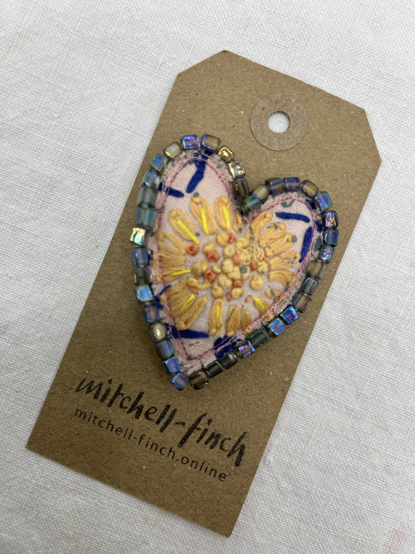 A recycled fabric tablecloth has been repurposed for this pretty heart brooch!