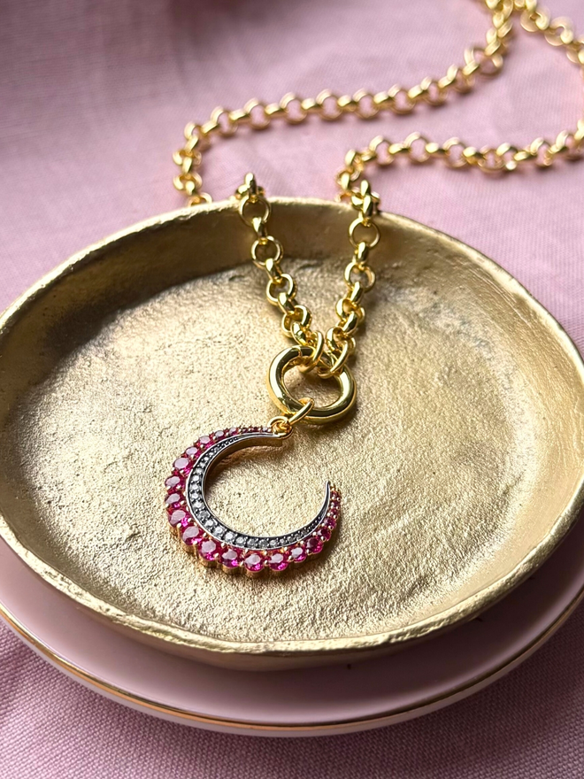 A glittering pink moon charm studded with crystals and finished with a delicate black rhodium plating. Anchored by a heavy gold chain, it’s a go to piece to be worn daily.