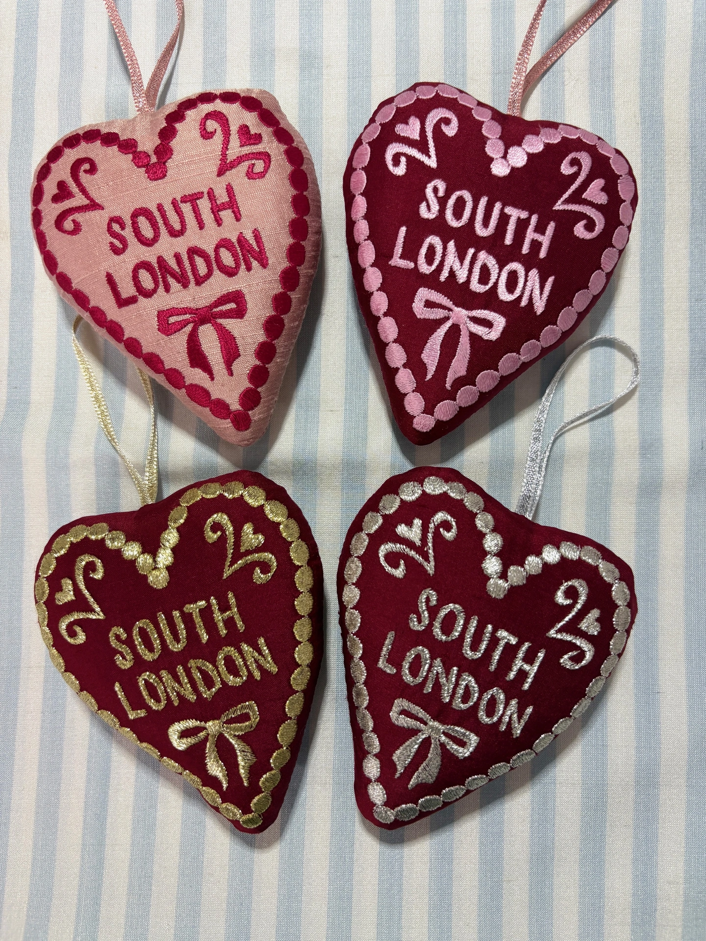 Freehand embroidered dupion silk heart ornaments for your favourite places in London! Made to order