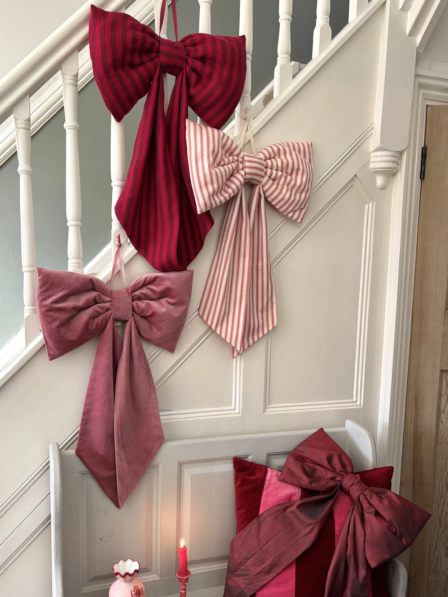 Hang on your front door, anywhere in the home or give as a gift! Our bows also look fabulous hanging above a mirror, on a banister or mantlepiece, and they make a lovely nursery or bedroom decoration. These are timeless pieces that can be used all year round.