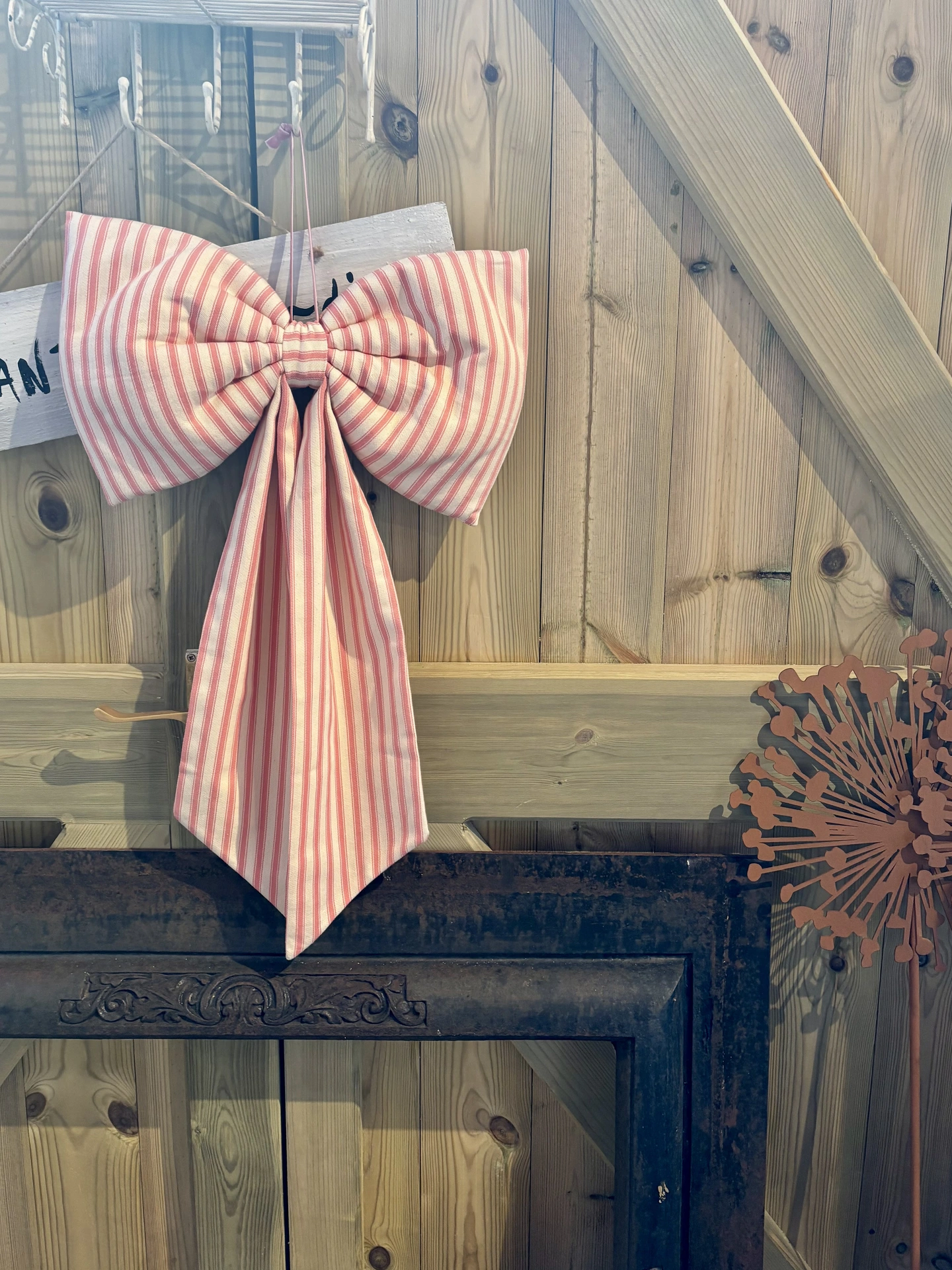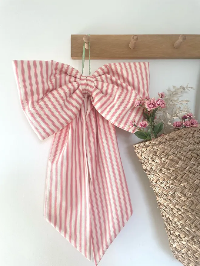 A beautiful oversized bow handmade from a gorgeous vibrant pink ticking stripe cotton fabric.
