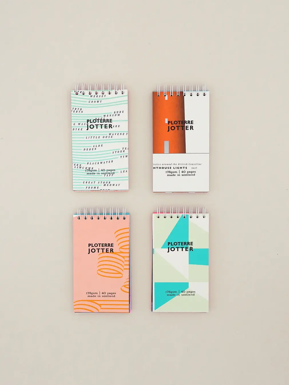 The jotters have 40 pages and each page is a piece of print. The covers have been made from heavier weight paper, overprinted with letterpress type and ring bound.