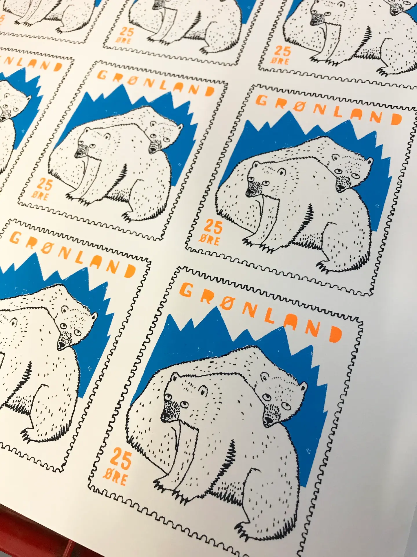 2 very cute polar bears on a (made up) Greenland stamp, mounted onto card.