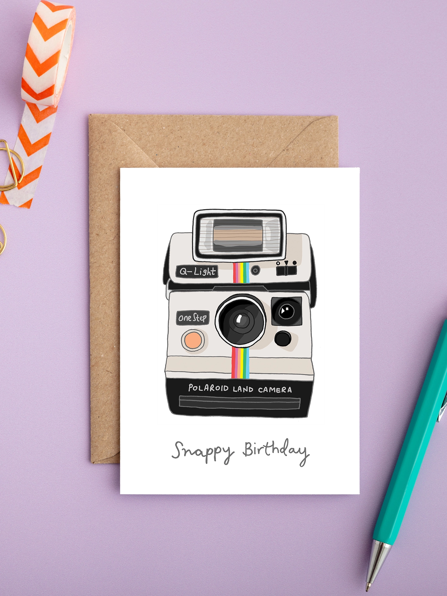 Capture a birthday moment in true retro style with this hand-drawn Polaroid camera card. A perfect greeting for photography fans and nostalgic souls, it features a vintage instant camera with the caption “Snappy Birthday” – because some moments deserve to be printed (and giggled at).