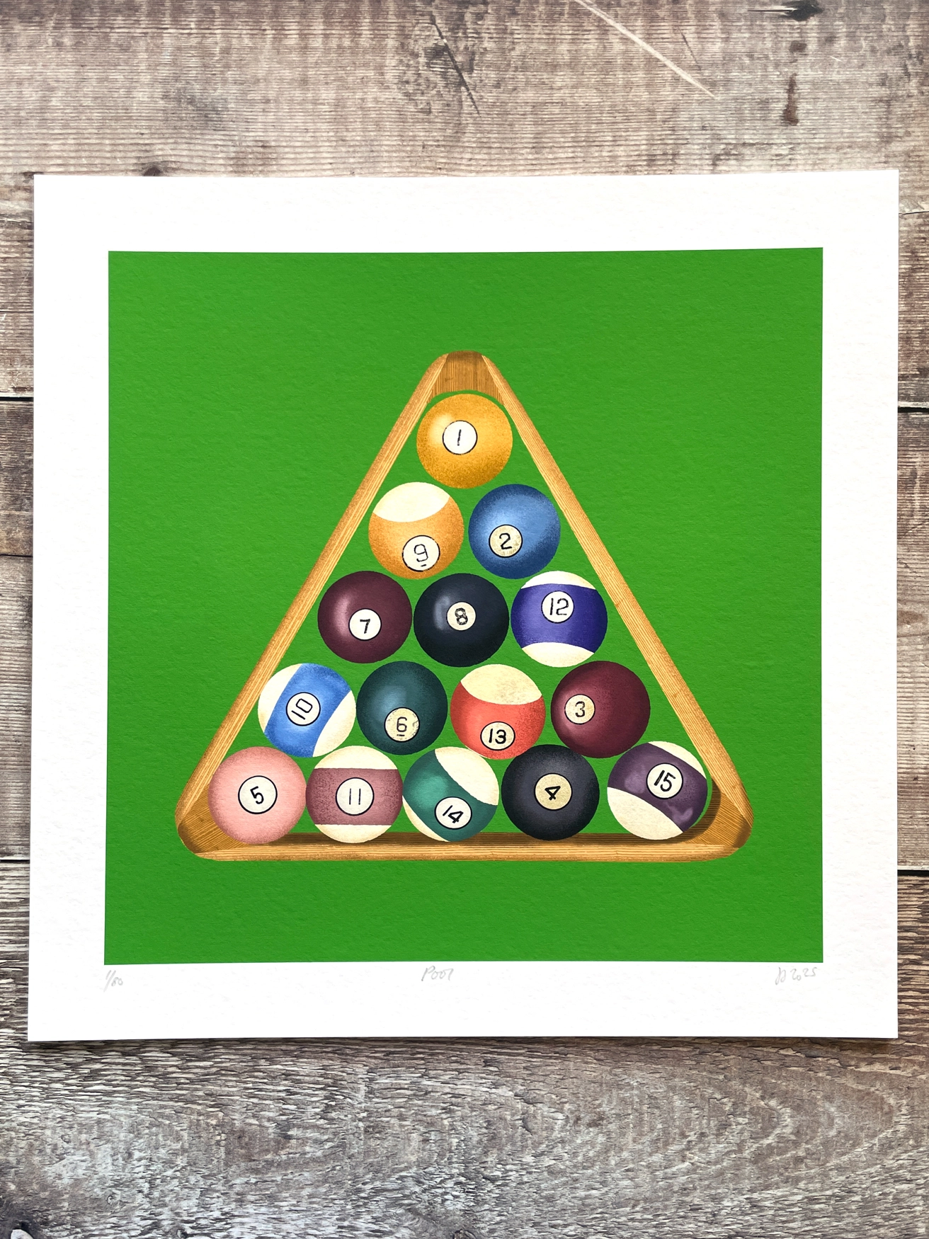 A hand-drawn illustration of vintage pool balls arranged in a classic wooden triangle, set against a rich green background — worn numbers, gently aged surfaces, and all the nostalgic charm of a game that has been played in the same unhurried way for generations. A celebration of the billiards hall at its most timeless and most characterful.
