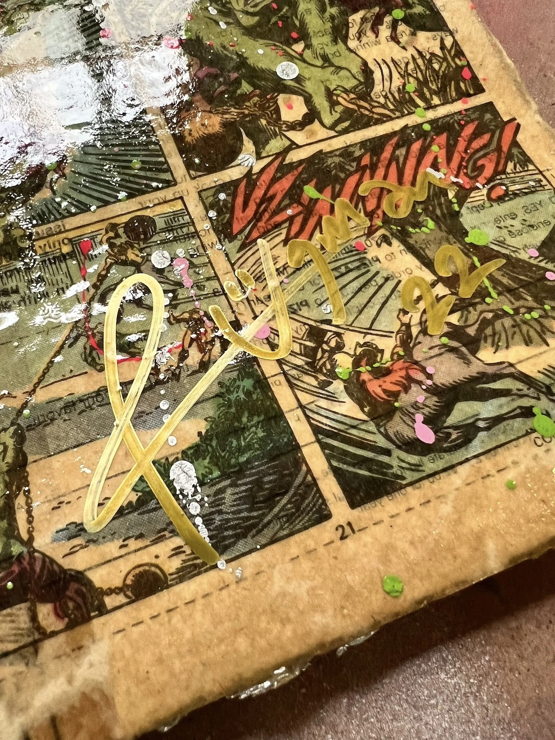Made from original 1970’s comic book pages, wheat pasted to the heaviest paper around to give it an almost 'bill poster' look. Then drenched it in 3 coats of varnish gloss before painting and stencilling the iconic Popeye the sailor.