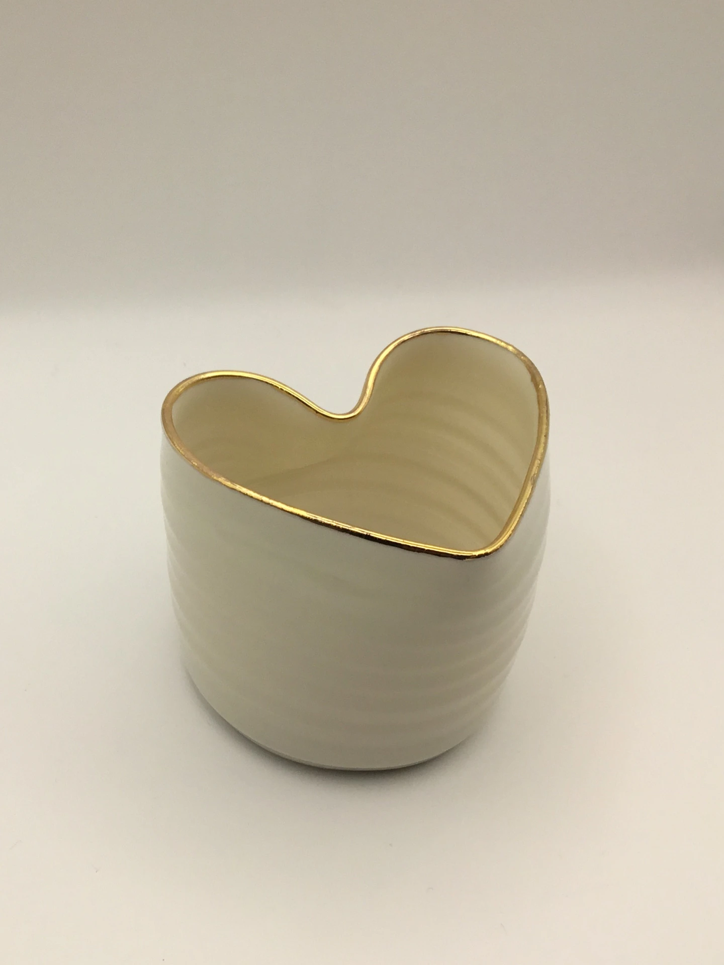 Hand-thrown porcelain heart tea light holder. The fineness of the porcelain makes them translucent when lit. All votives are glazed transparent inside. Available in white with a gold rim, slate blue, turquoise and green.