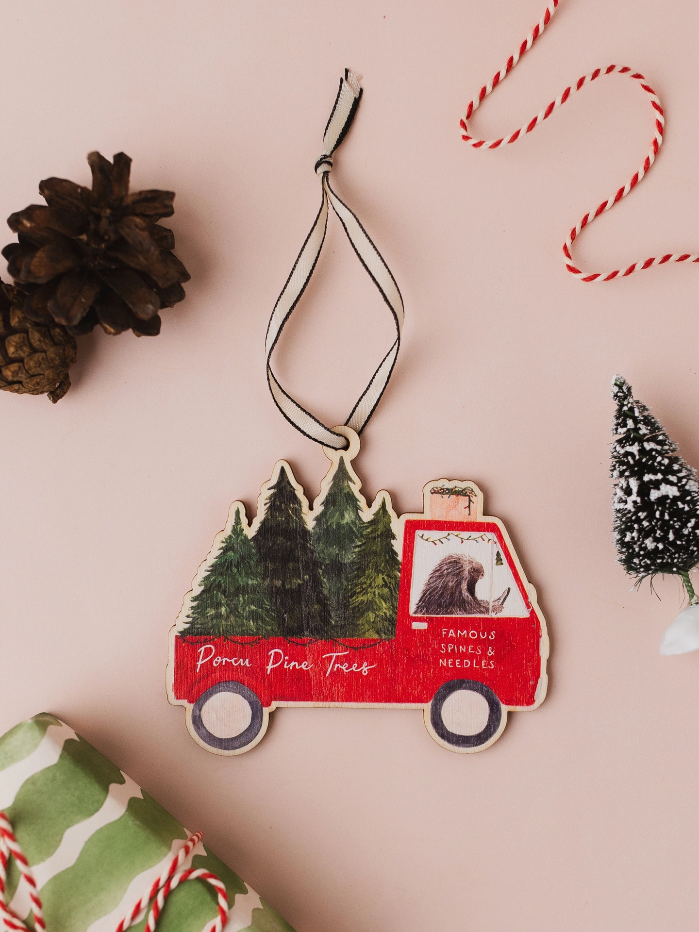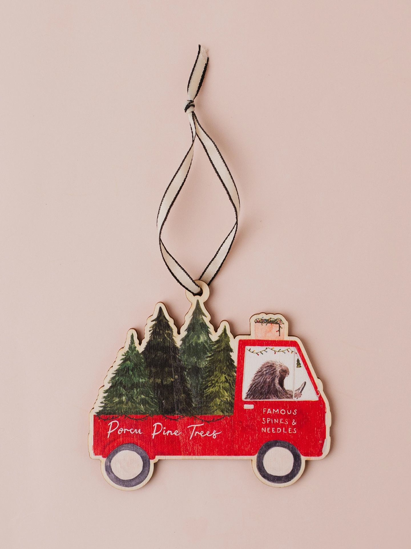 A wooden decoration of a porcupine in his van delivering Christmas trees, perfect to hang around the house or on your Christmas tree this festive season.