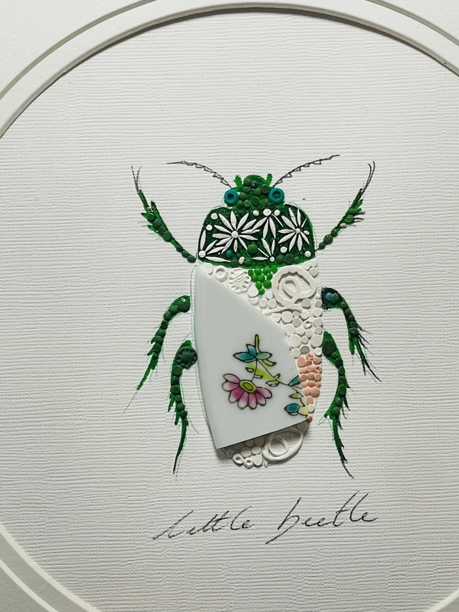 Hand-drawn, painted, mosaic clay, vintage pottery insect on white double mounted card, in a black circular frame.