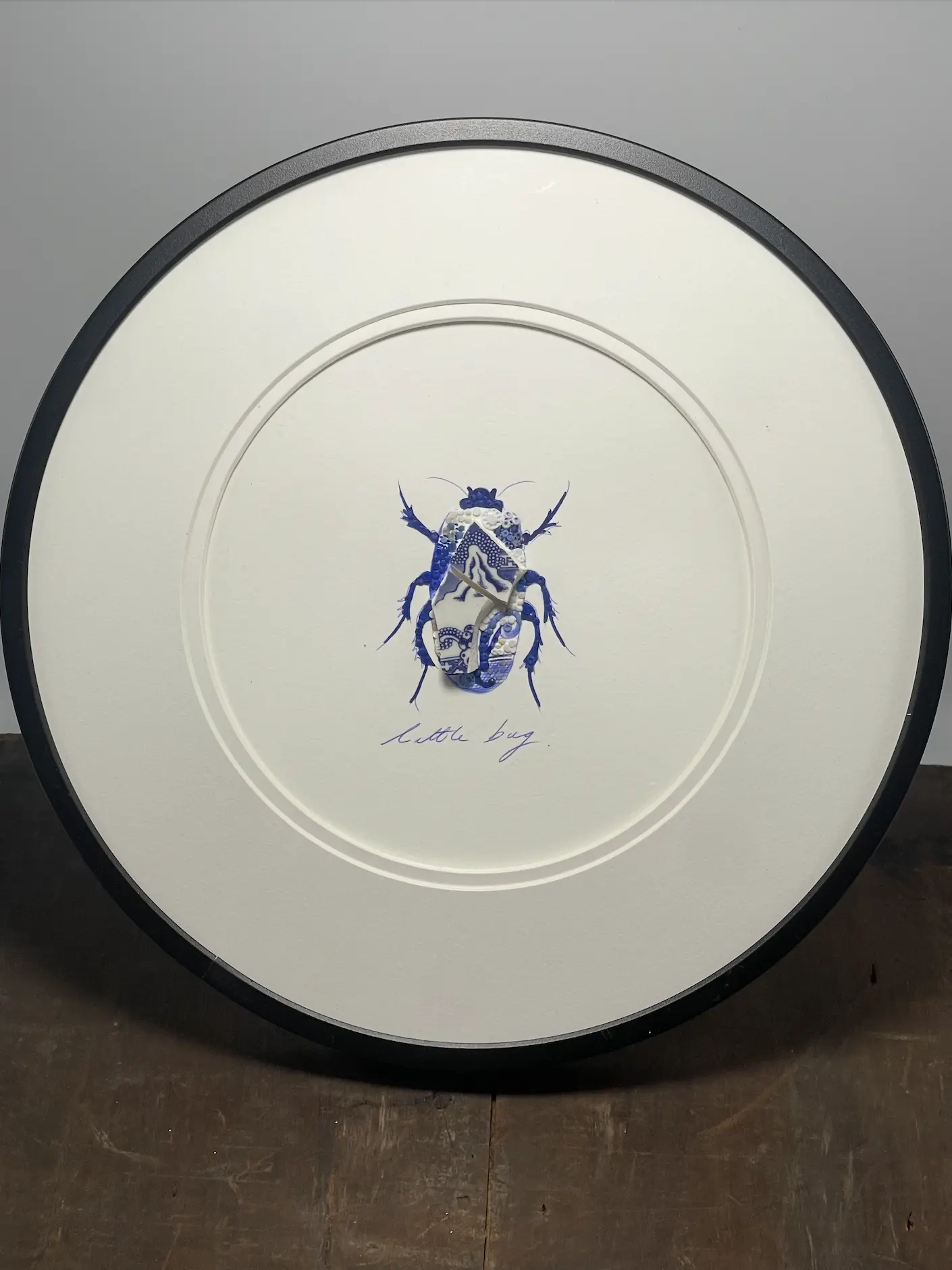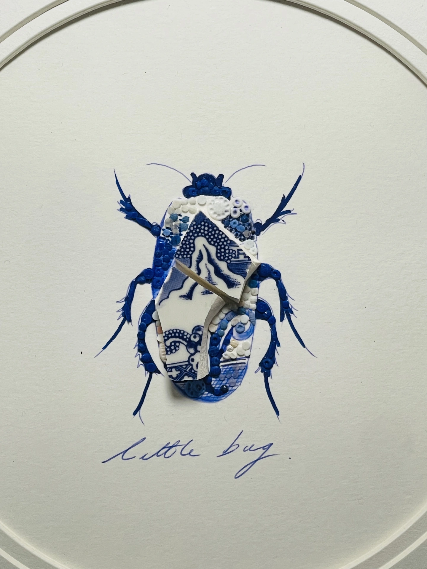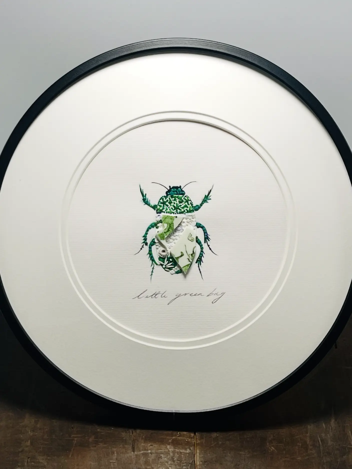 Hand-drawn, painted, mosaic clay, vintage pottery insect on white double mounted card, in a black circular frame.