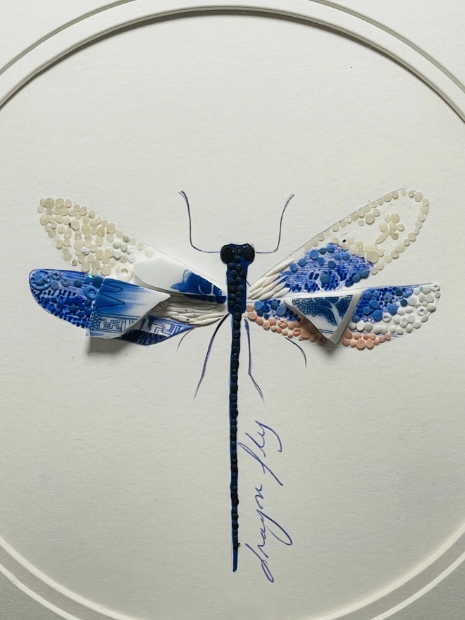 Hand-drawn, painted, mosaic clay, vintage pottery insect on white double mounted card, in a black circular frame.