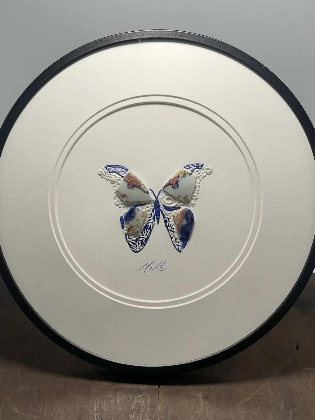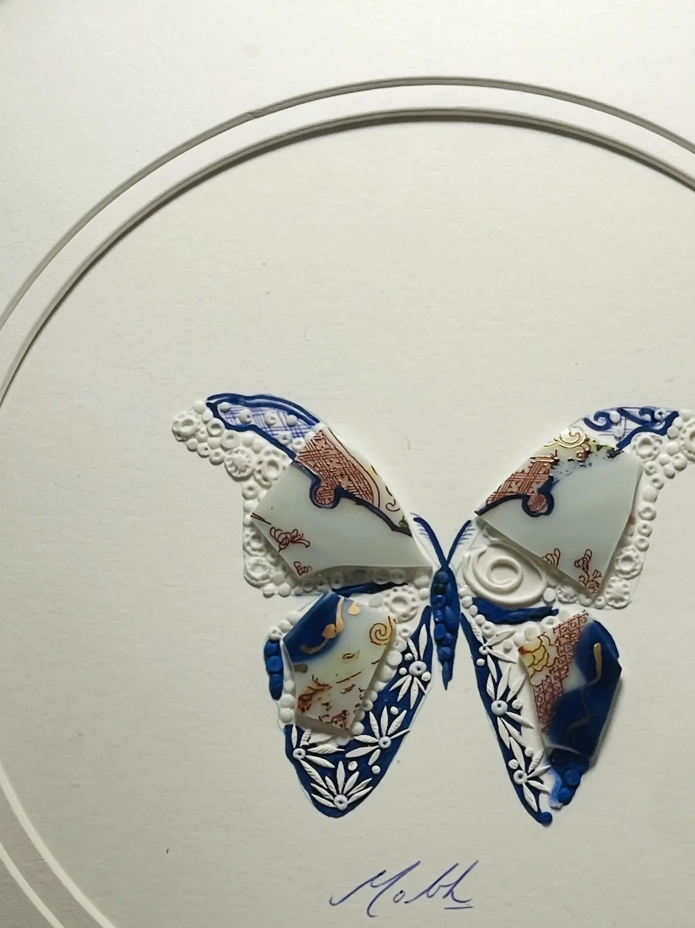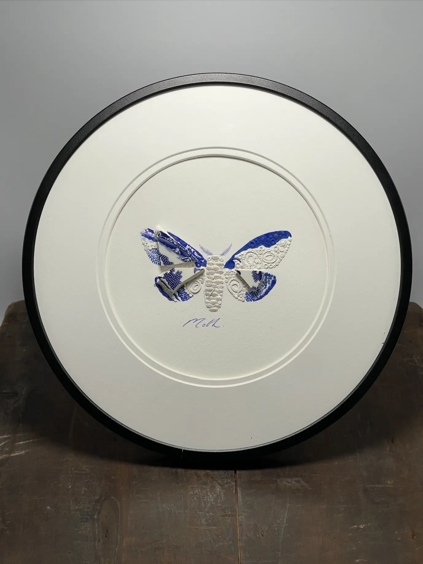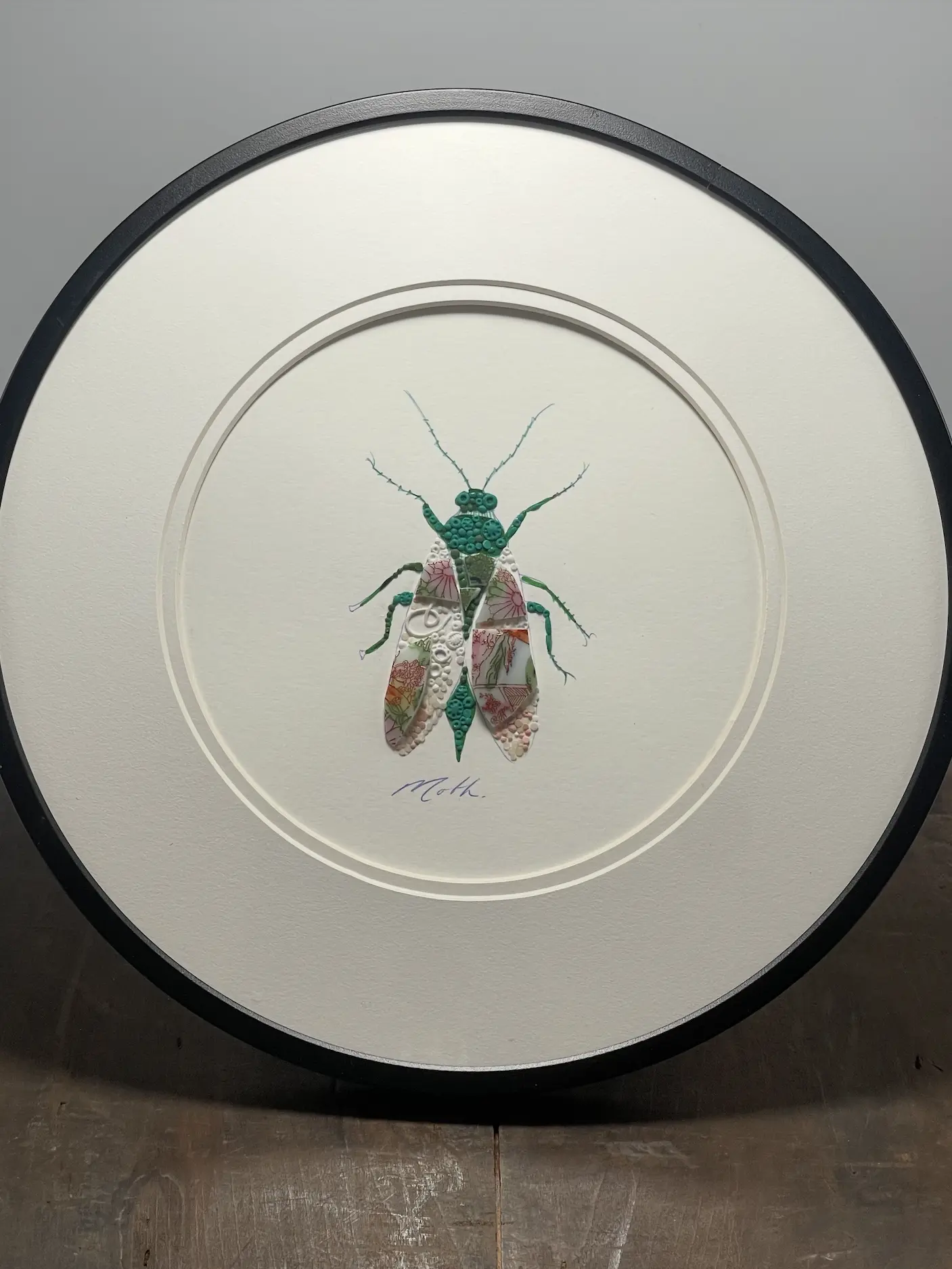 Hand-drawn, painted, mosaic clay, vintage pottery insect on white double mounted card, in a black circular frame.