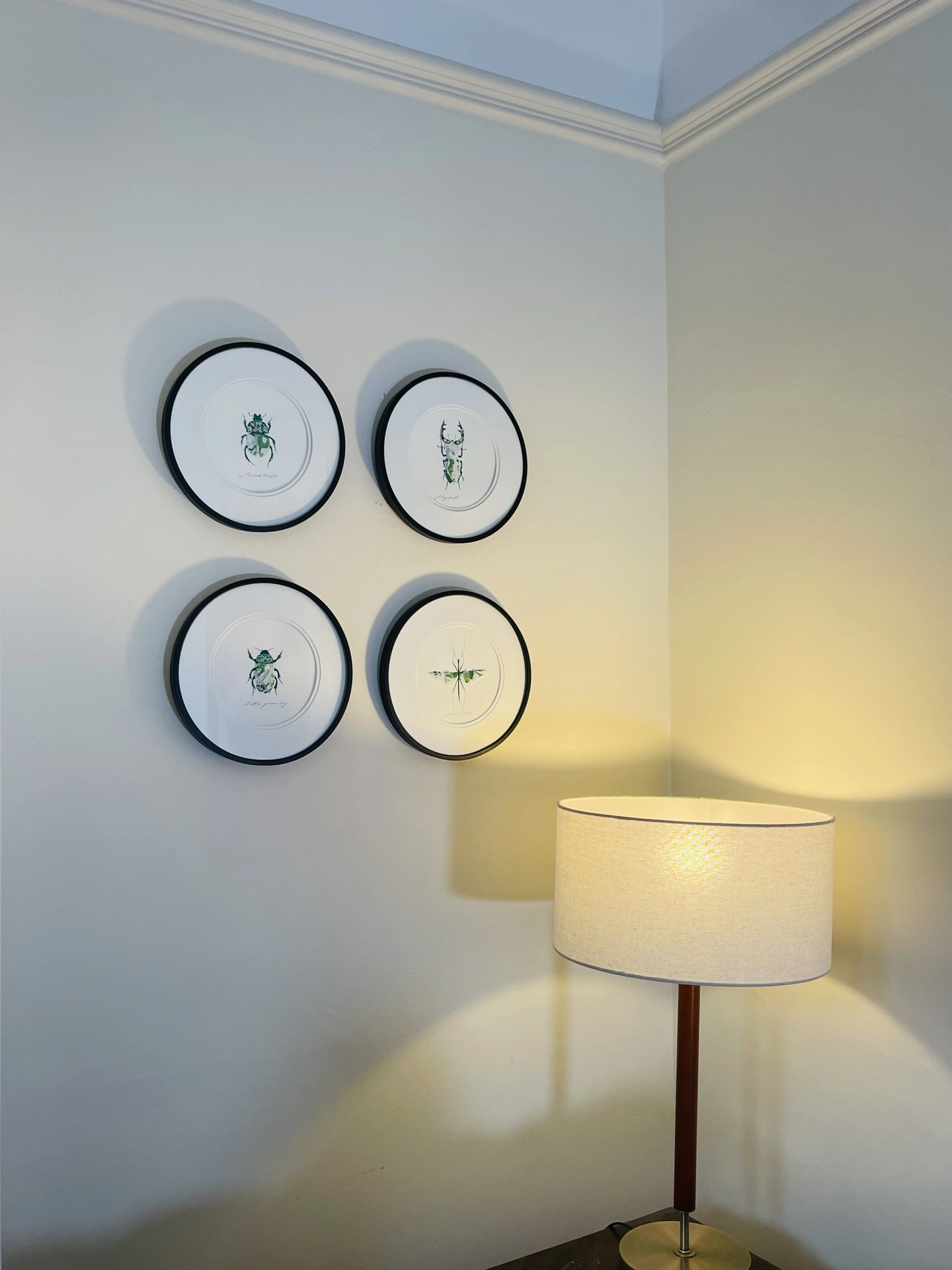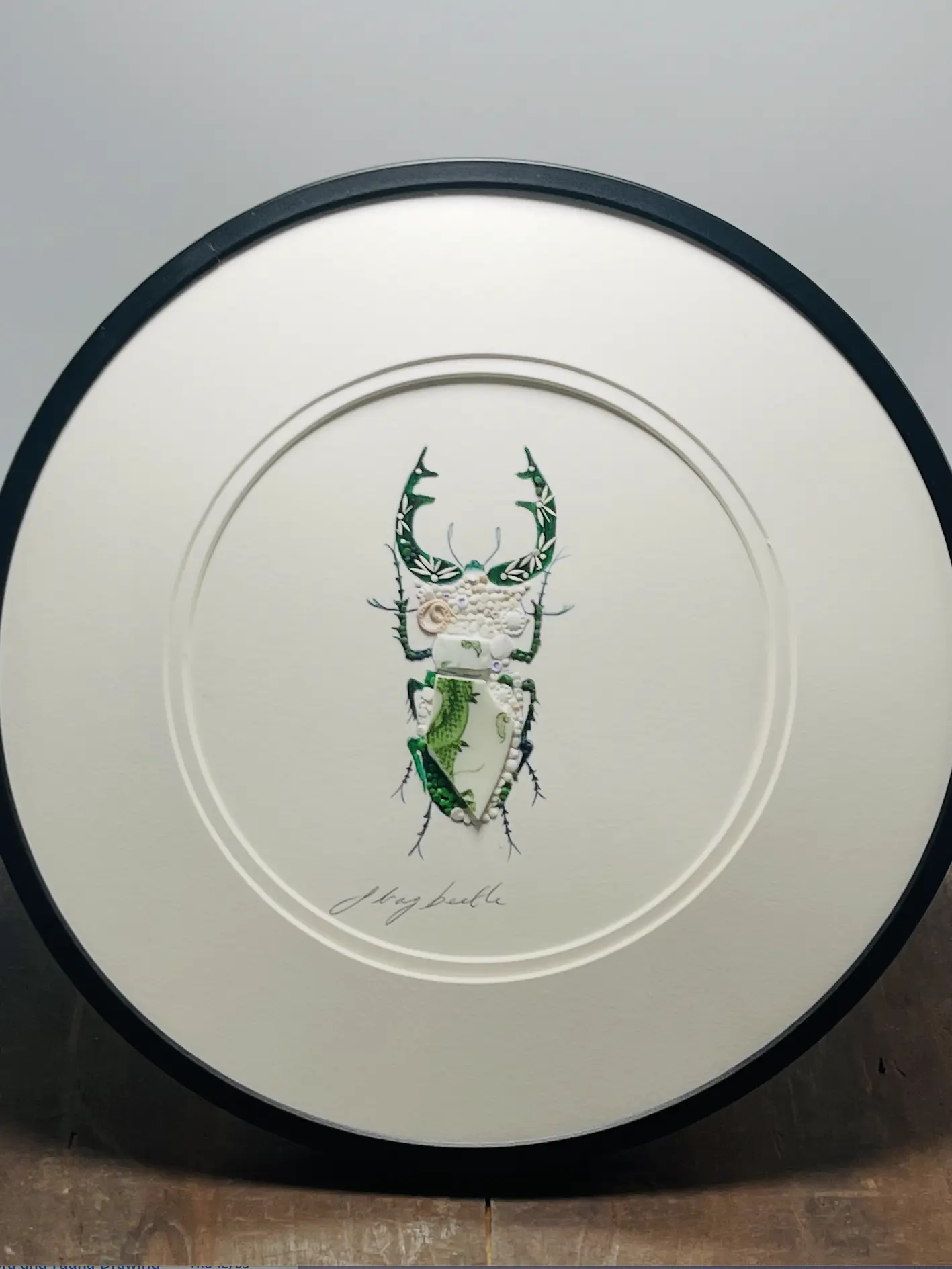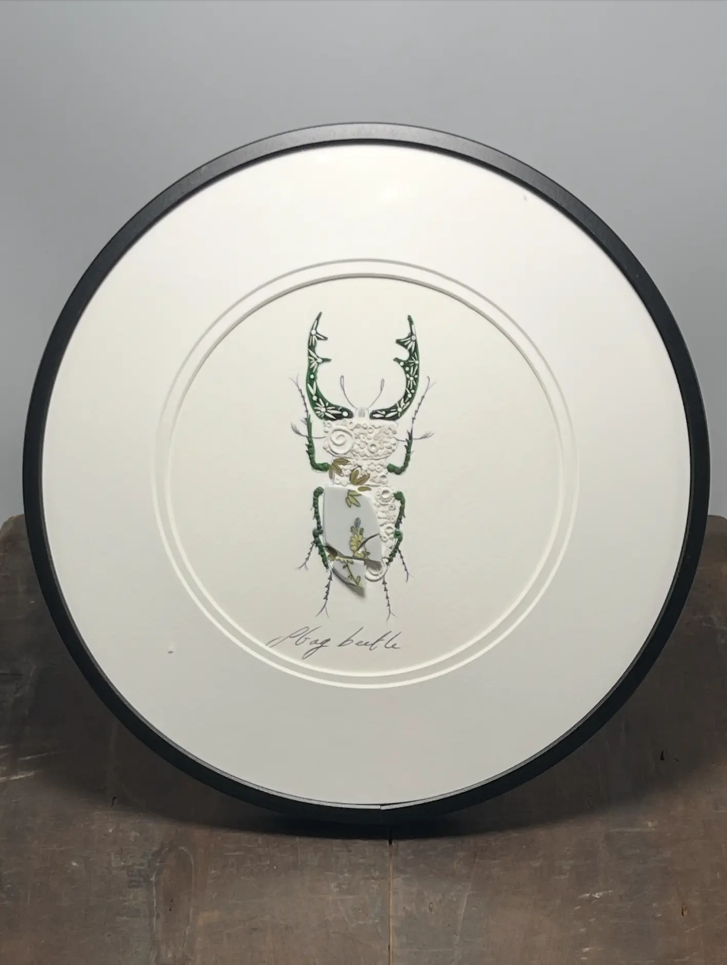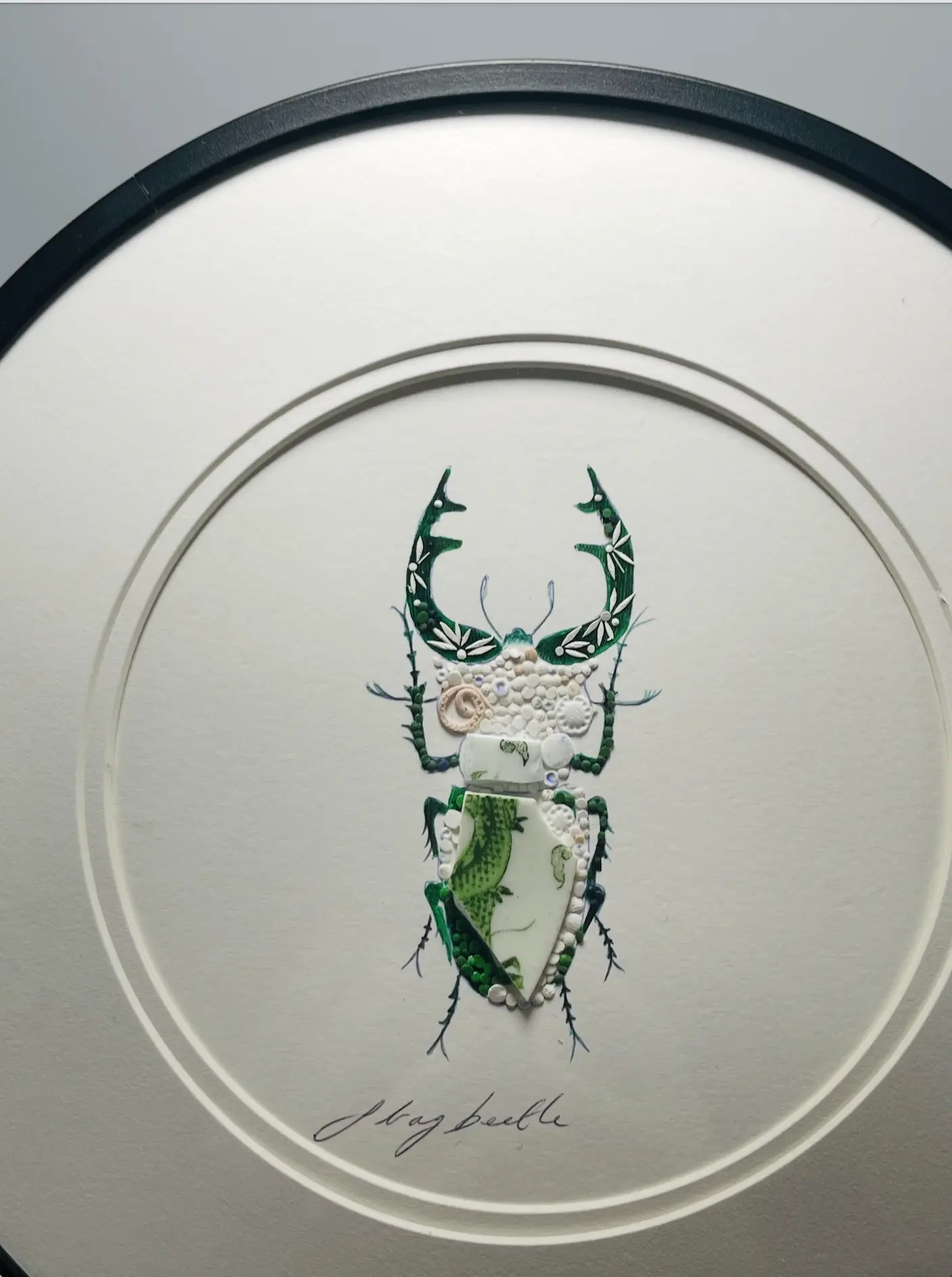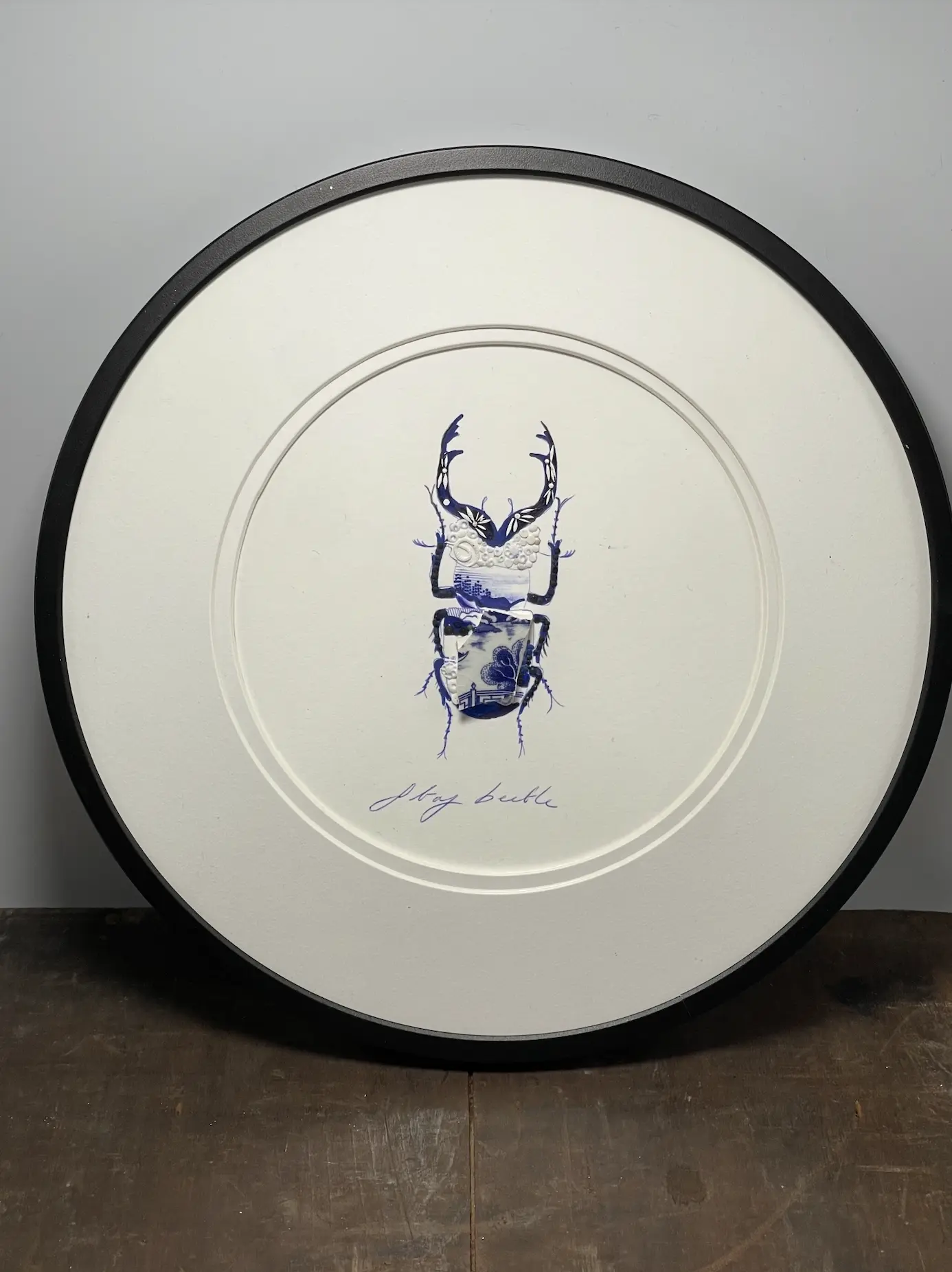 Hand-drawn, painted, mosaic clay, vintage pottery insect on white double mounted card, in a black circular frame.