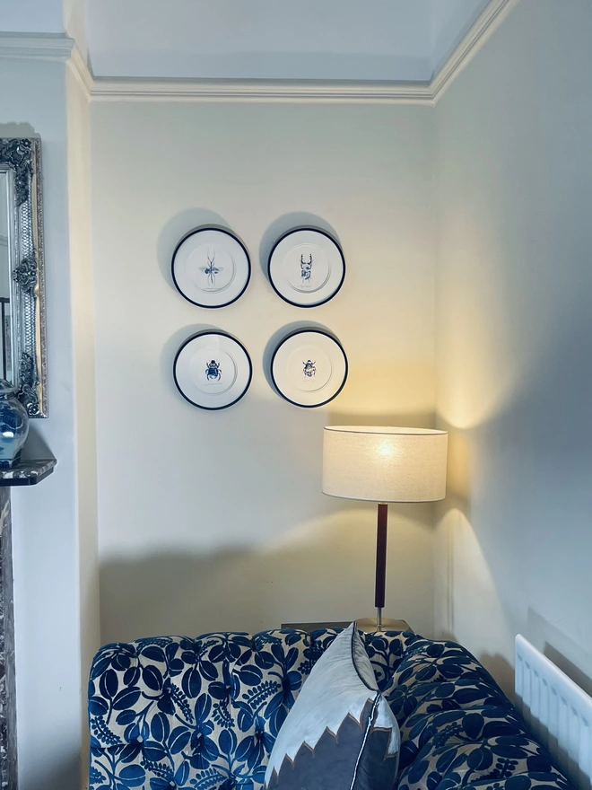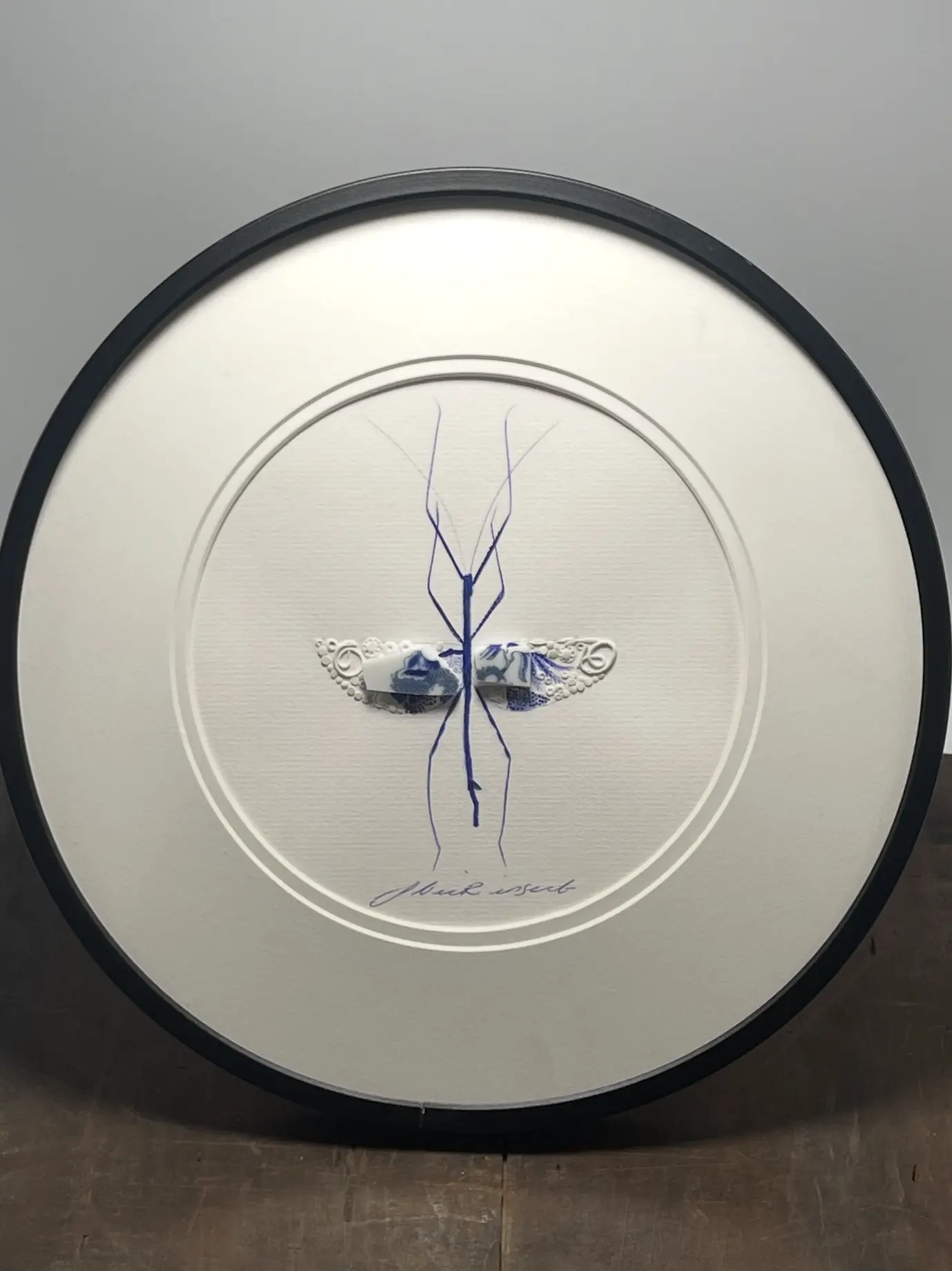 Hand-drawn, painted, mosaic clay, vintage pottery insect on white double mounted card, in a black circular frame.