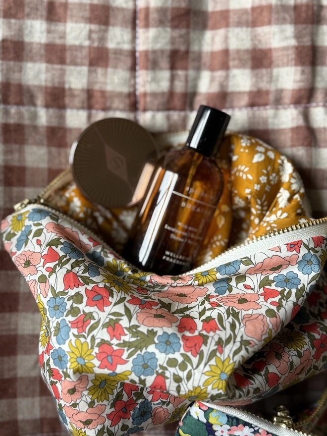 These useful pouches are handmade from Liberty fabrics and finished with a brass zip. Finished with Poppy and Daisy on the outside and lined with Capel in Mustard, The purses are padded for extra durability and could be used as make up bag, pencil case or travel pouch (the options are endless).