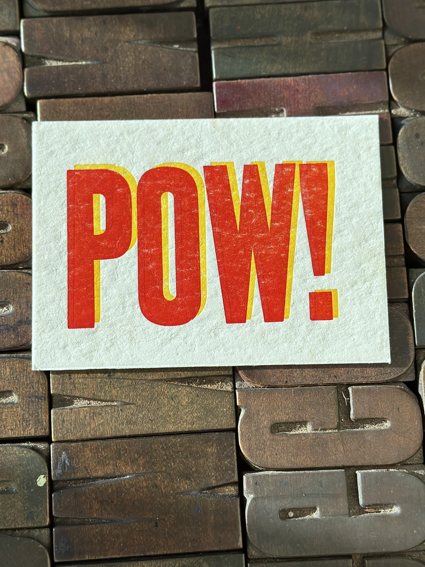 Letterpress printed postcard that packs a punch! These cards are printed using original wooden type, each card is printed by hand first in yellow and then in red to give the striking 3D effect. Each card is unique. Printed on thick, textured cotton card.
