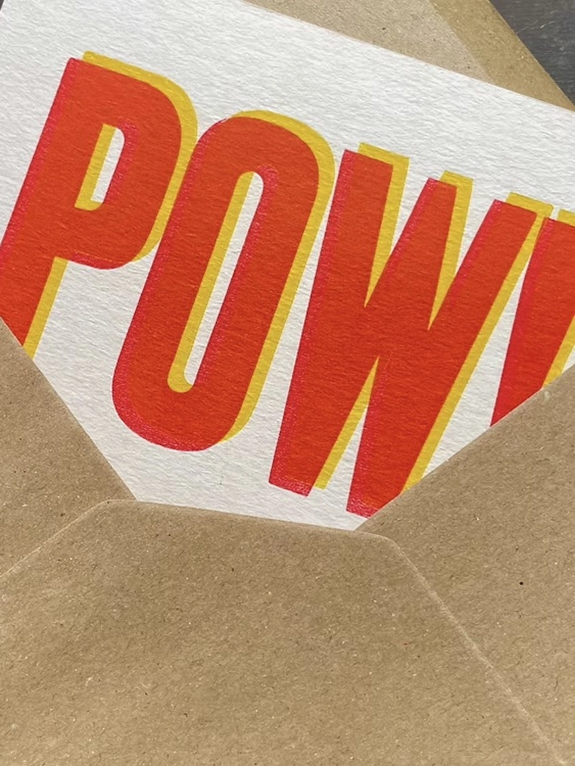 Letterpress printed postcard that packs a punch! These cards are printed using original wooden type, each card is printed by hand first in yellow and then in red to give the striking 3D effect. Each card is unique. Printed on thick, textured cotton card...