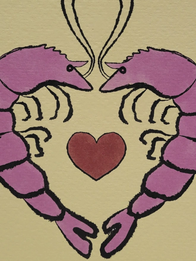 Printed greetings card with pink prawns and red love heart on a pale yellow background.