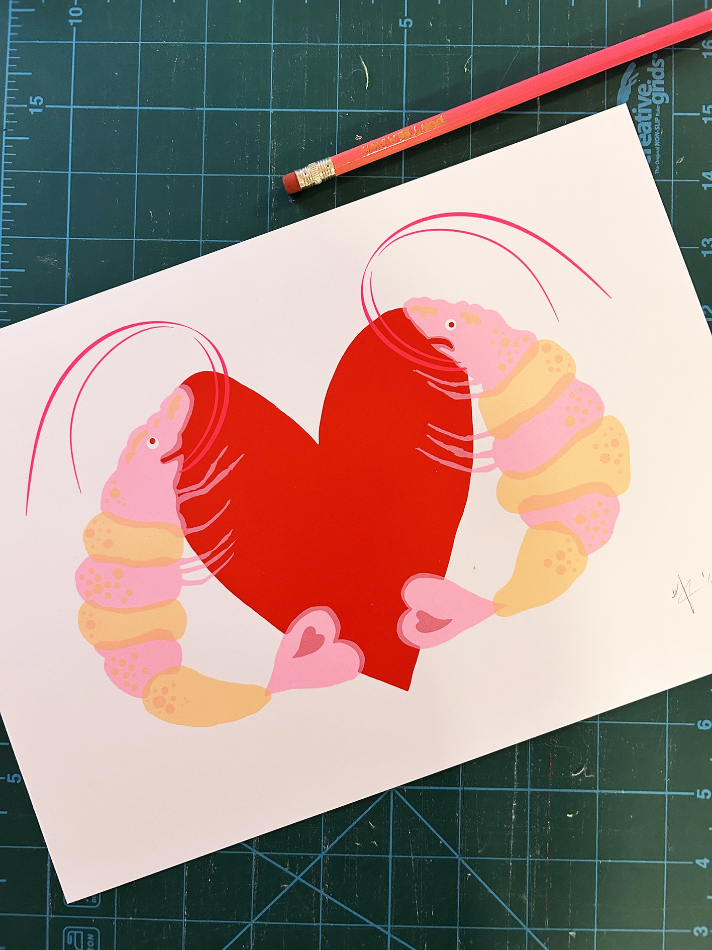Prawn Love! This funny screen print has been a design I have played with for a while Its my best selling Greetings Card this year whch I had riso printed. I always wanted to turn it into a Screen Print and after a few requests I have finally done it.