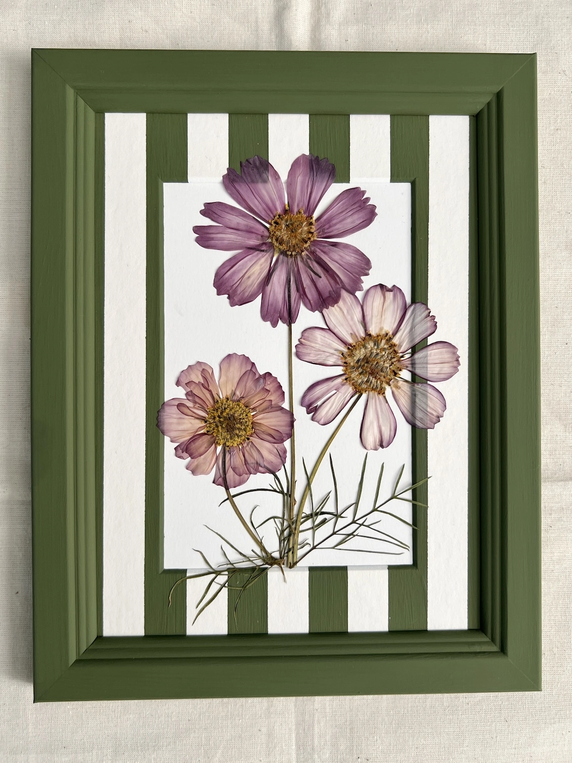 Pressed Cosmos flowers from my garden in London carefully pressed and preserved, are showcased on a hand painted stripe mount surrounded by a beautiful hand painted wooden frame...