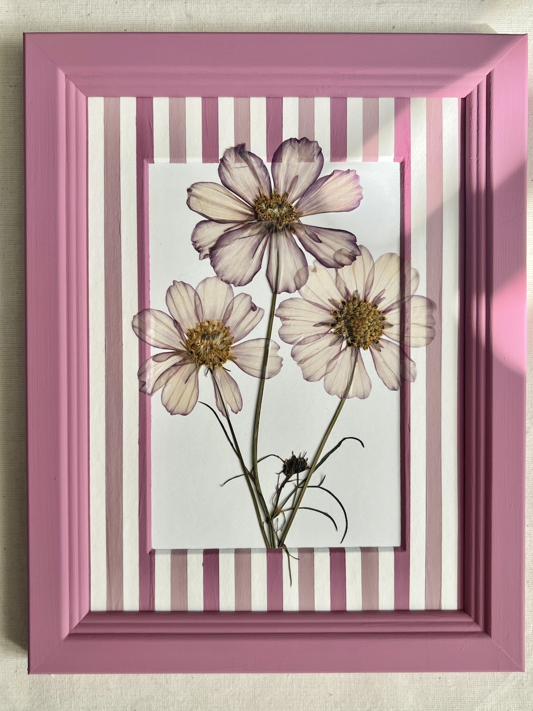 Pressed Cosmos flowers from my garden in London carefully pressed and preserved, are showcased on a hand painted stripe mount surrounded by a beautiful hand painted wooden frame...