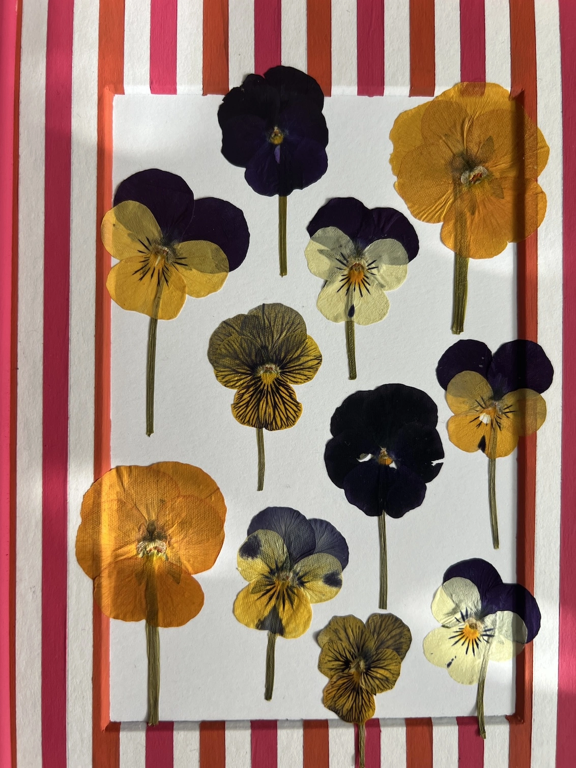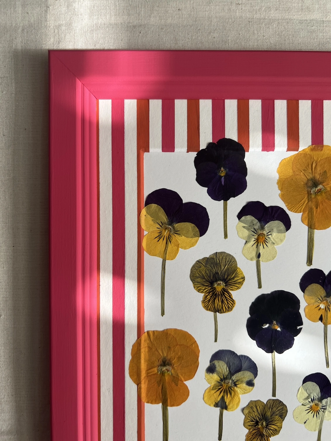 Pressed Pansy flowers from my garden in London carefully pressed and preserved, are showcased on a hand painted stripe mount surrounded by a beautiful hand painted wooden frame.