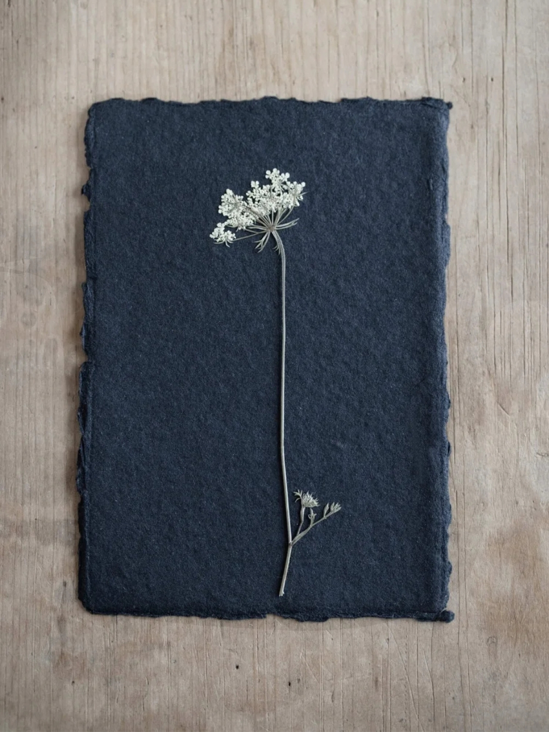 A beautiful finishing touch for a calming space, this original pressed flower work features a small wild carrot specimen. Mounted on textured black handmade paper that highlights the star-like shape of its tiny petals, this one-of-a-kind pressing comes re...