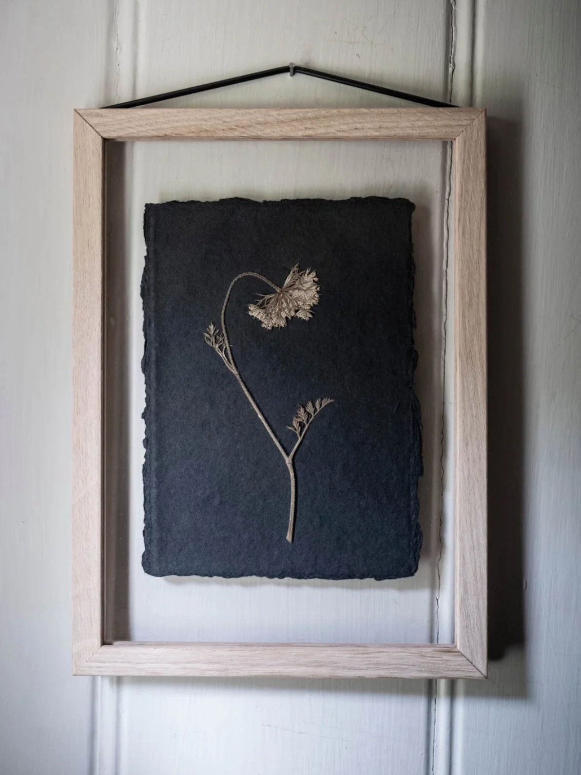 A beautiful finishing touch for a calming space, this original pressed flower work features a small wild carrot specimen. Chosen for its unique charm, its gently curved stem and bowed head add to its character.