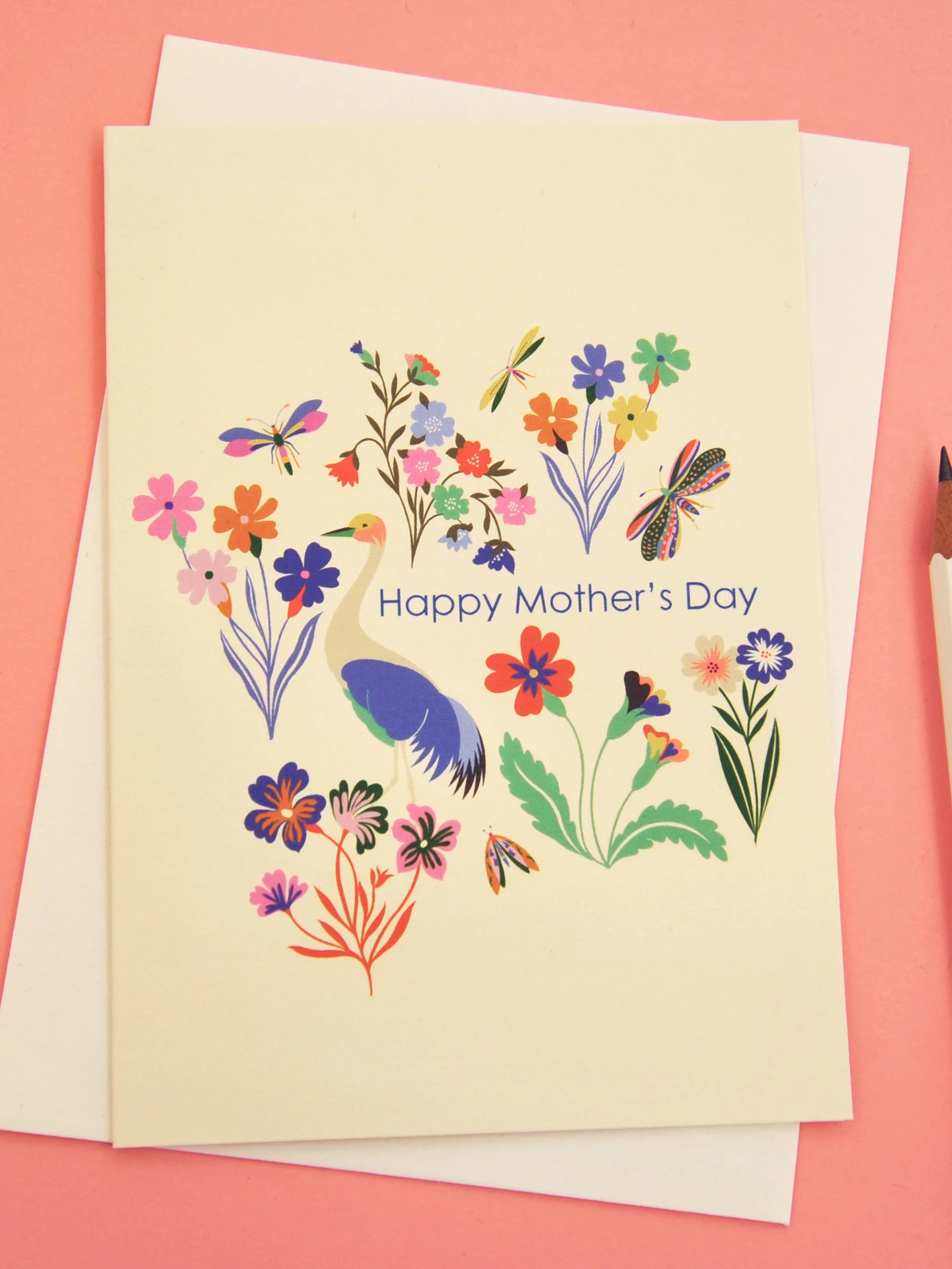 A pretty Happy Mother’s Day card featuring a delicate floral illustration in soft, joyful colours, with butterflies and a sweet little bird nestled among the blooms. The gentle mix of flowers and nature details gives this design a warm, uplifting feel — p...