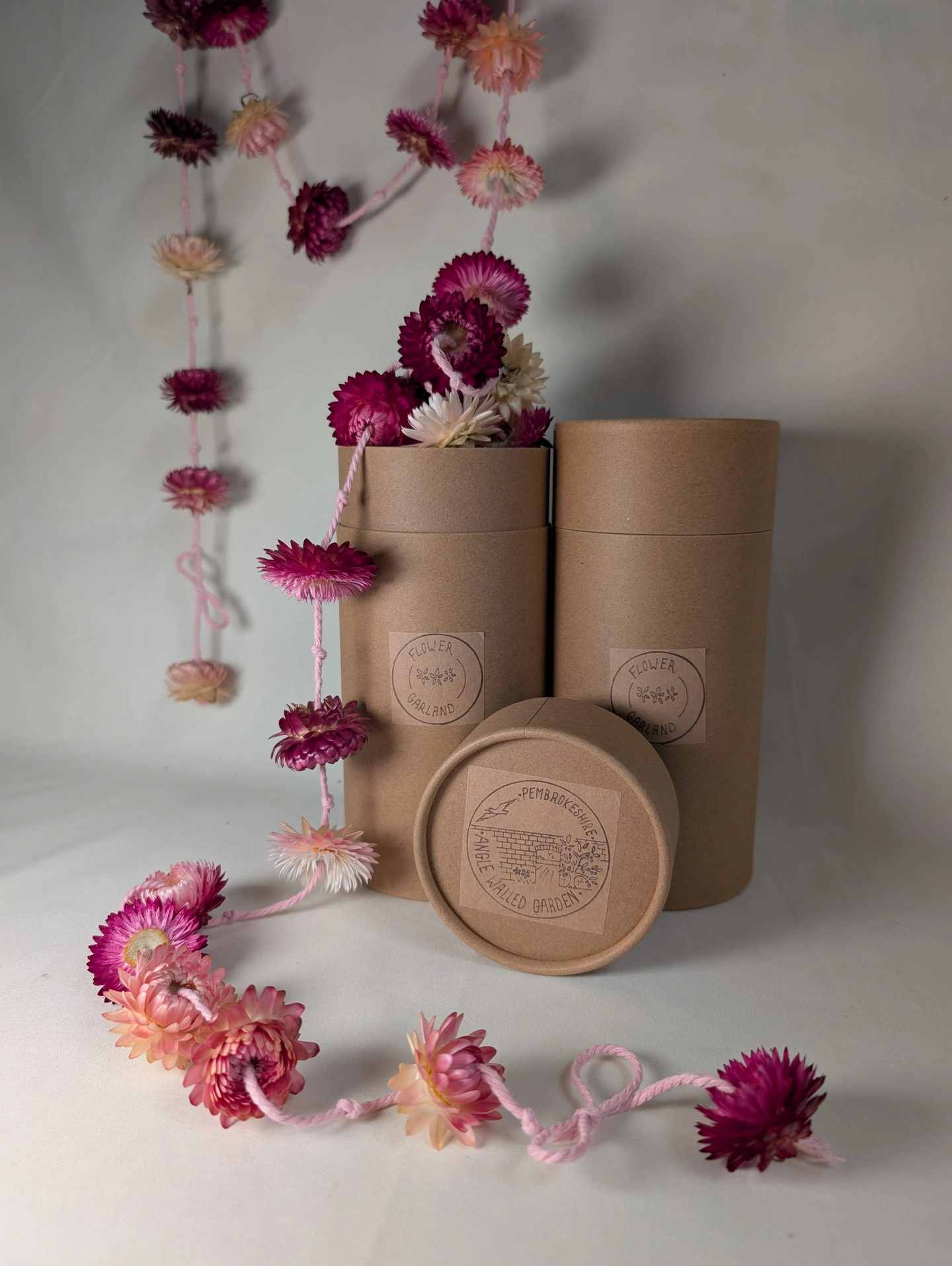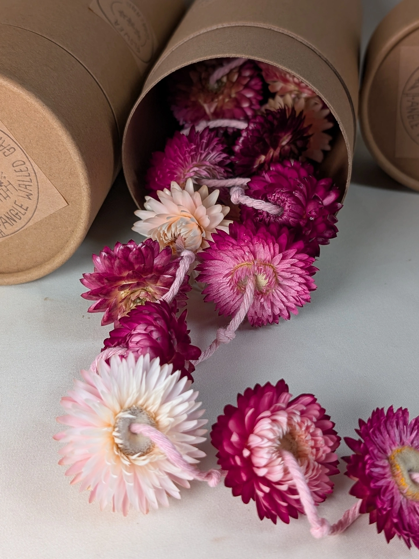 Beautiful pink and white strawflowers carefully arranged along 2 meters of natural pink cotton cord. Presented in a beautifully simple card tube box.