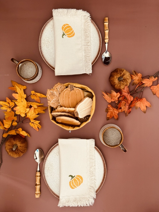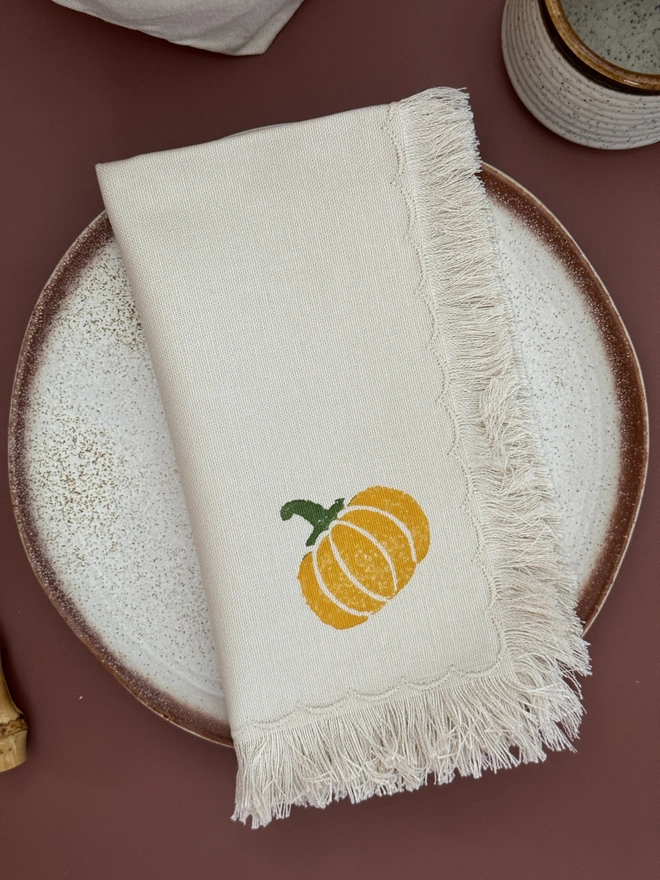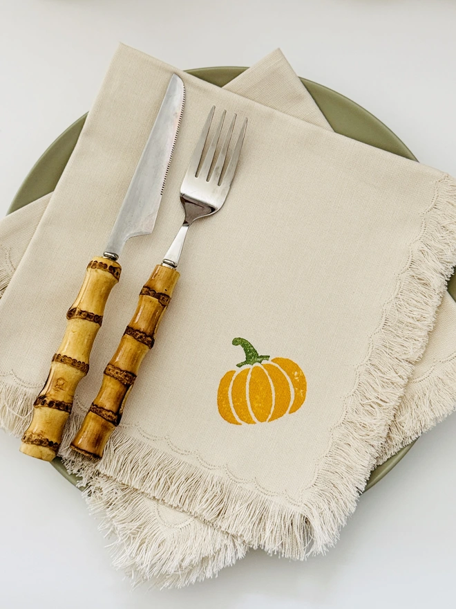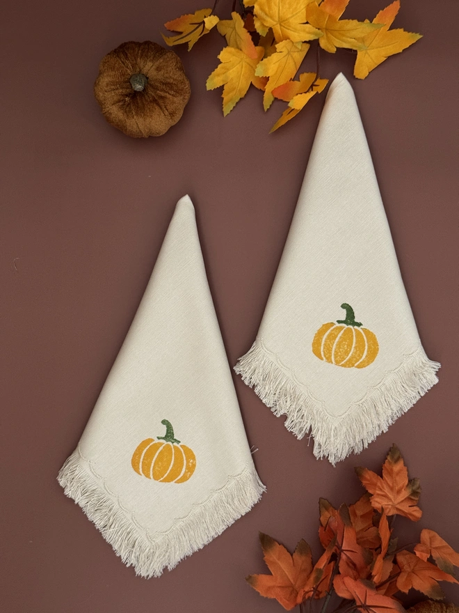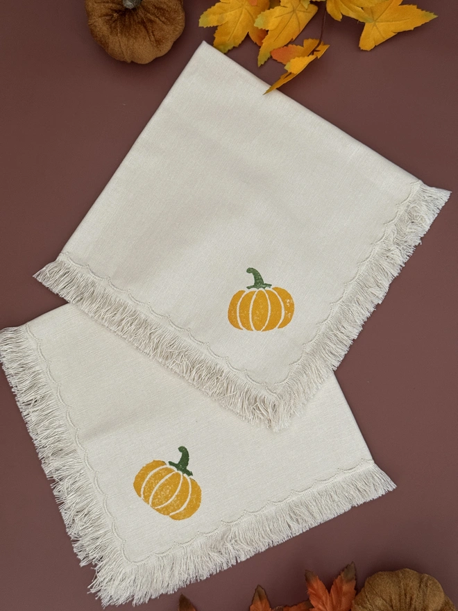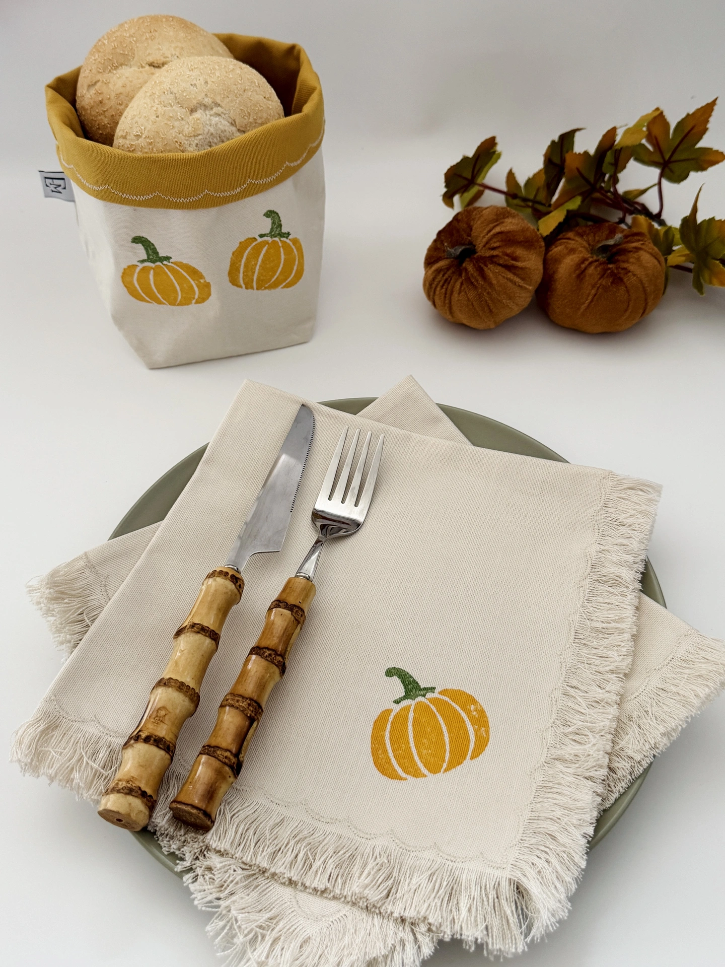 These gorgeous pumpkin block-printed fringe cloth napkins are perfect for your table decor this fall season.
