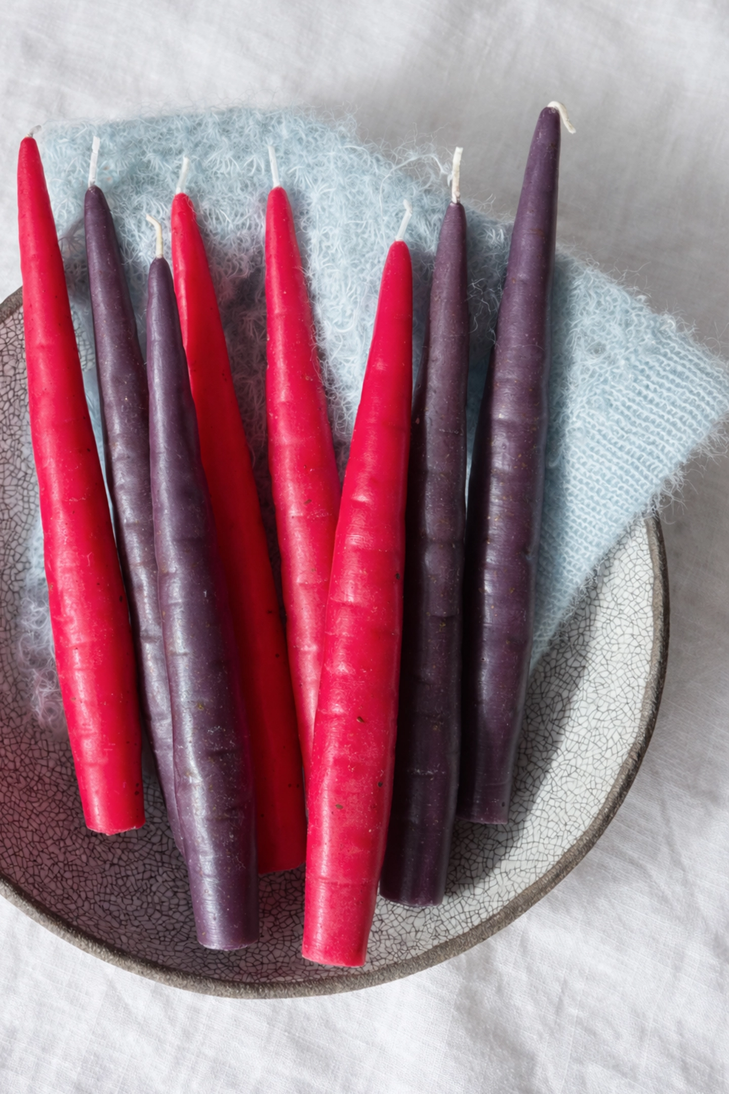 Eight colourful tapered carrot shaped candle sticks with two of each colour. Orange, Yellow, Pink and Purple. Each carrot candlestick has been decorated with ridges and splatters to create a realistic carrot shape!
