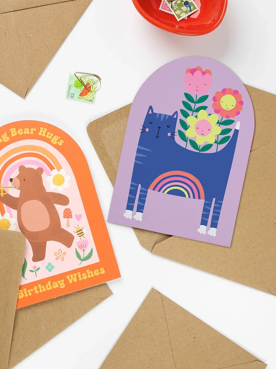 Featuring a blue cat with little white paws and a rainbow belly, this arched shaped birthday card has a lilac background, a rainbow, and three stemmed flowers with sweet faces. It doesn't have a caption so it can be sent for lots of different memorable occasions and it was designed and made in the UK .