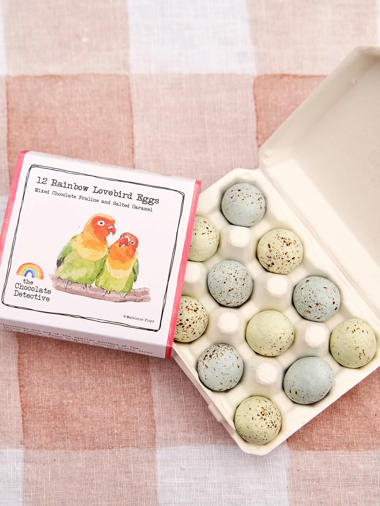 12 Chocolate Eggs, 6 filled with a fine hazelnut praline and 6 with a subtle salted caramel. A layer of milk and dark chocolate is filled with caramel or praline and then wrapped in a fine sugar shell and life-like speckles. Please note that colour combinations may vary seasonally.