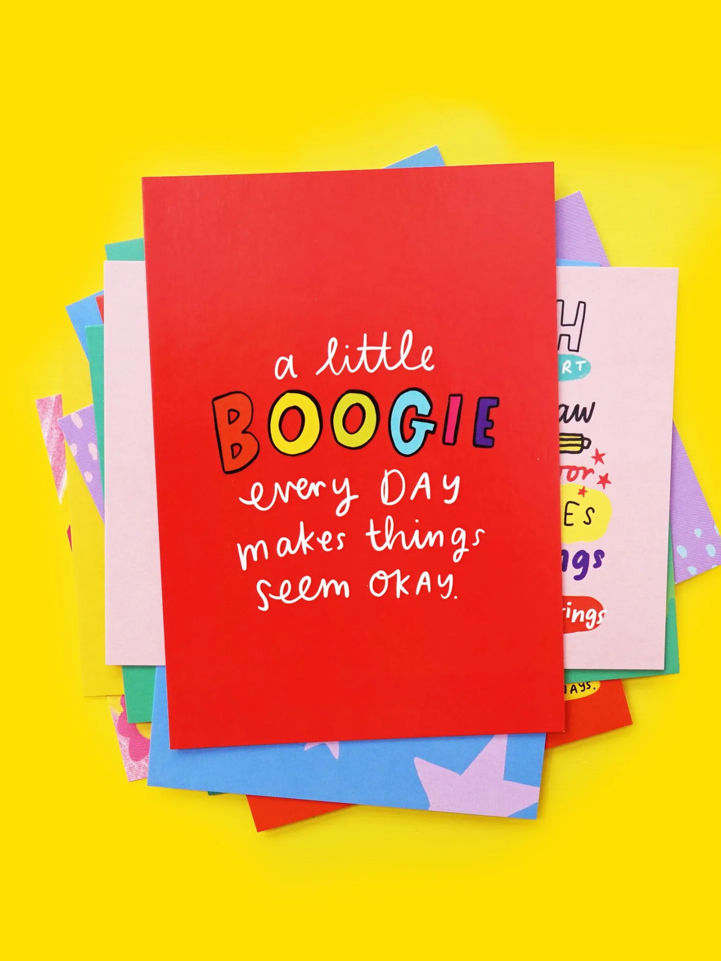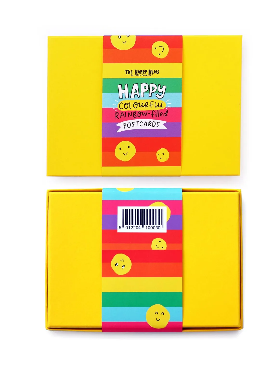Colourful, rainbow-filled postcards designed by Emily Coxhead, inside a yellow gift box.